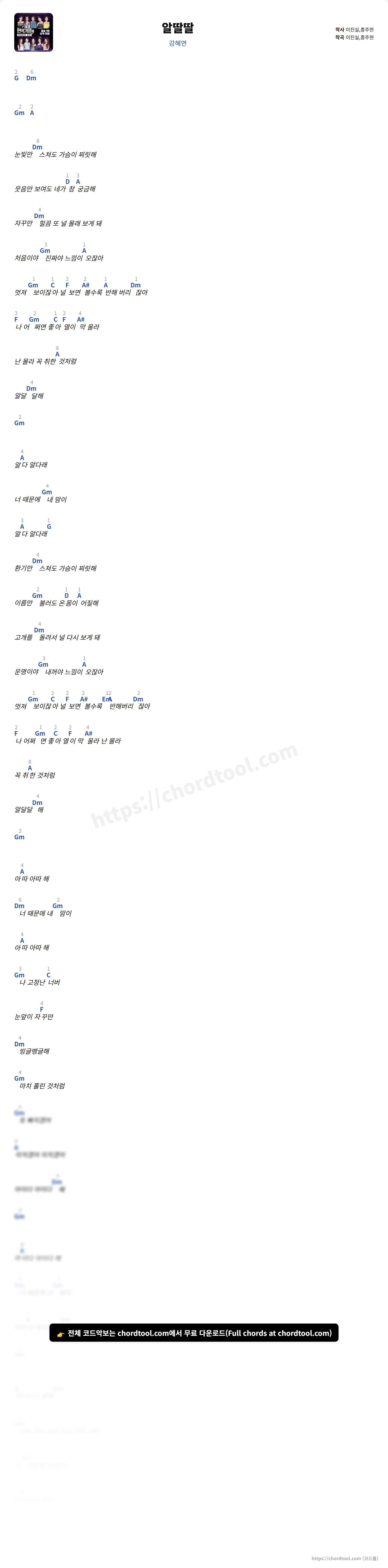 강혜연의 알딸딸 가사를 확인할 수 있습니다. 곡 정보와 함께 연주에 필요한 코드, 악보 제공 여부도 함께 정리했습니다.