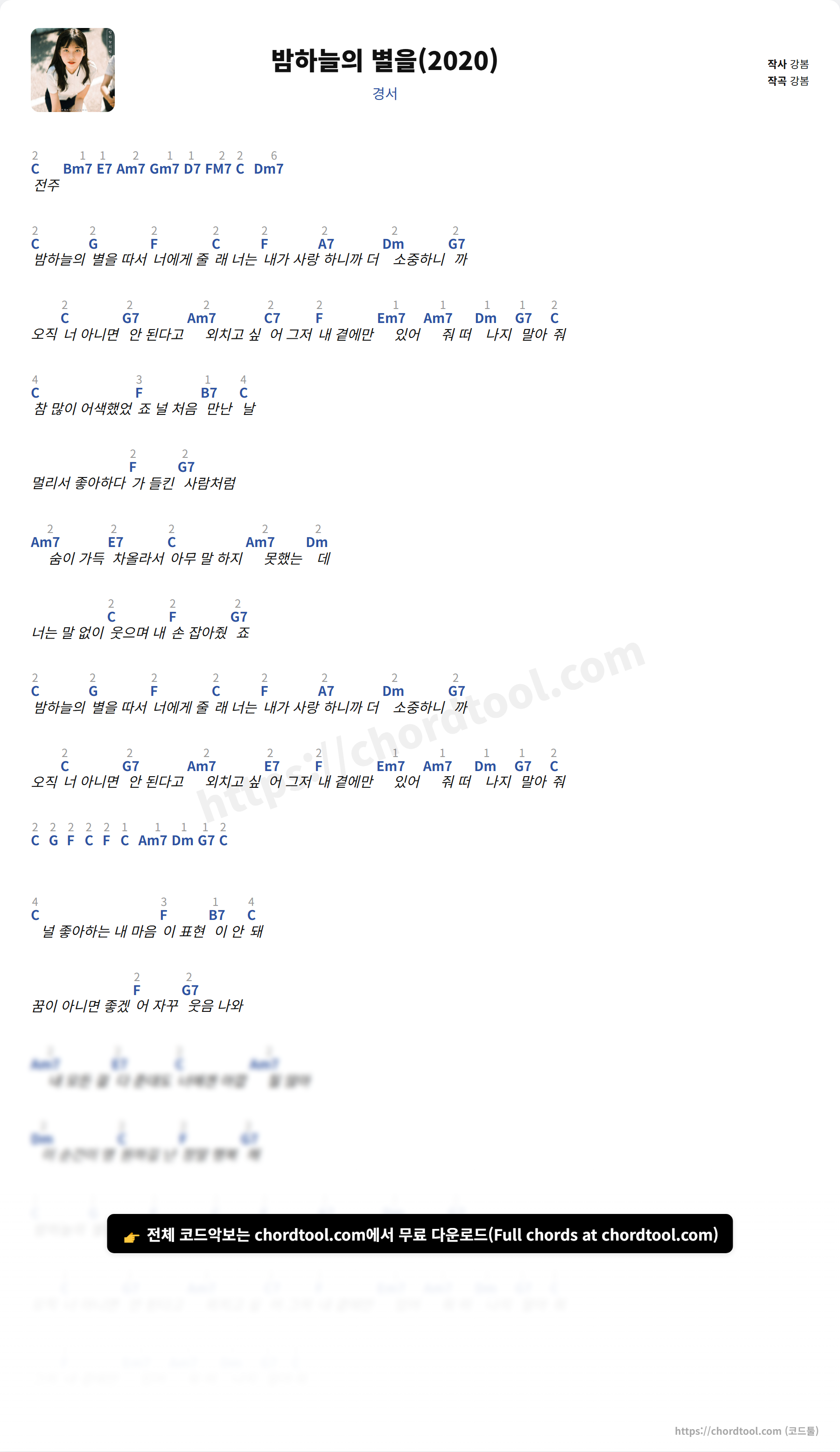밤하늘의 별을(2020)는 가사만 찾는 사용자뿐 아니라 기타 코드, 우쿨렐레 코드, 피아노 코드까지 함께 찾는 경우가 많습니다.