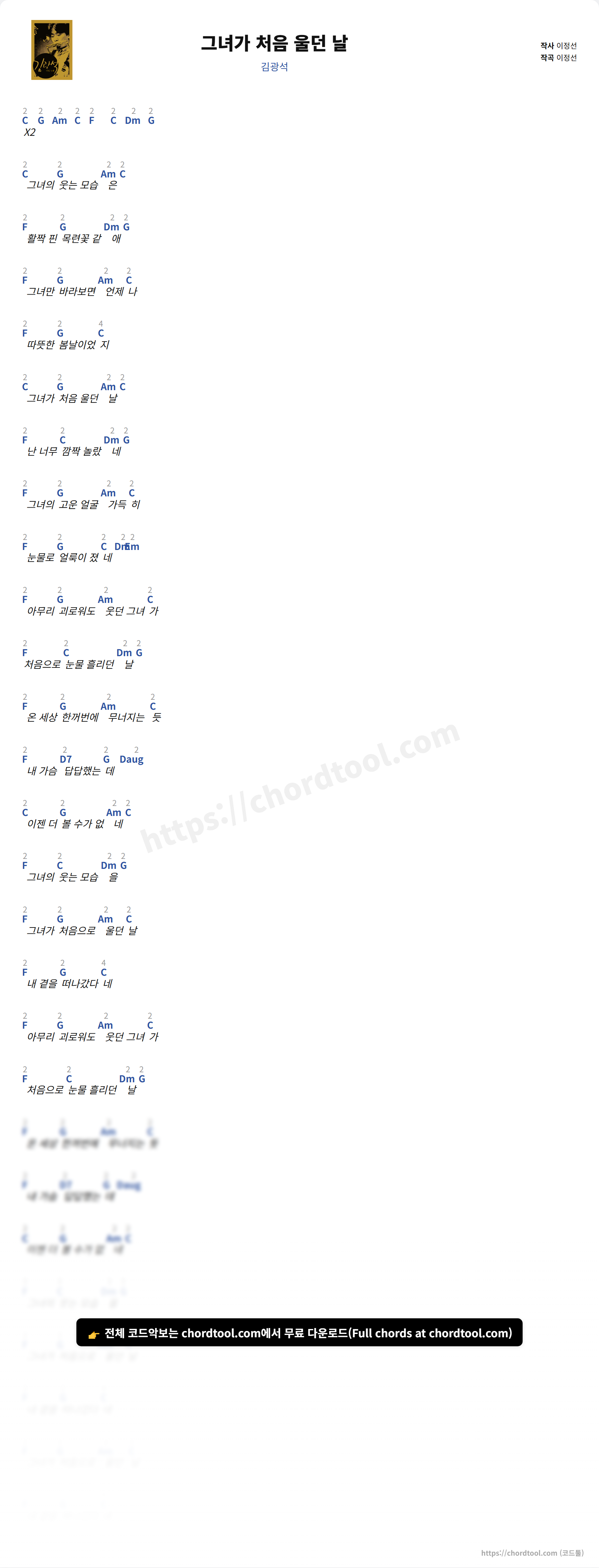김광석의 "그녀가 처음 울던 날" 가사 페이지입니다. 곡 정보와 함께 코드 진행, 악보 제공 여부를 한눈에 확인할 수 있도록 구성했습니다. 현재 코드악보가 제공되고 있으며 다양한 악기 코드표도 확인 가능합니다. |