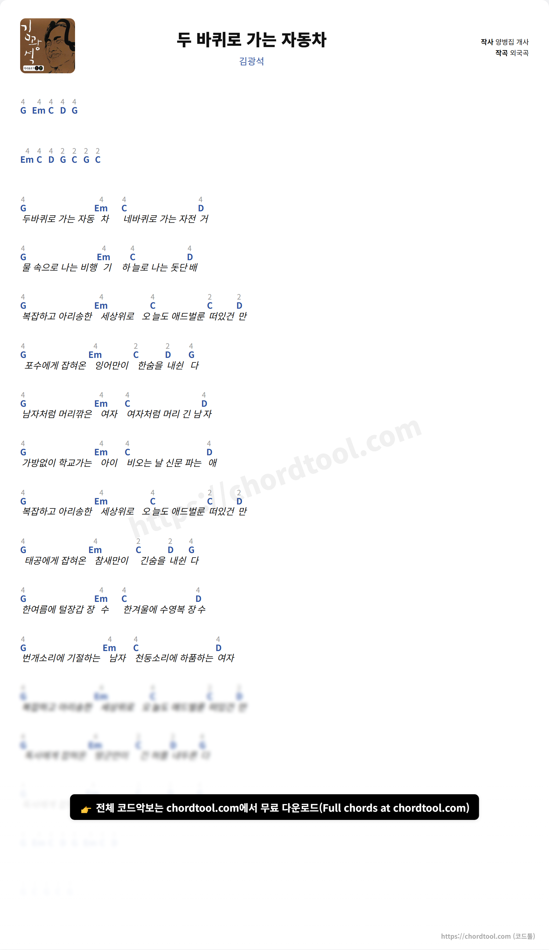 김광석의 두 바퀴로 가는 자동차 가사를 확인할 수 있습니다. 곡 정보와 함께 연주에 필요한 코드, 악보 제공 여부도 함께 정리했습니다.