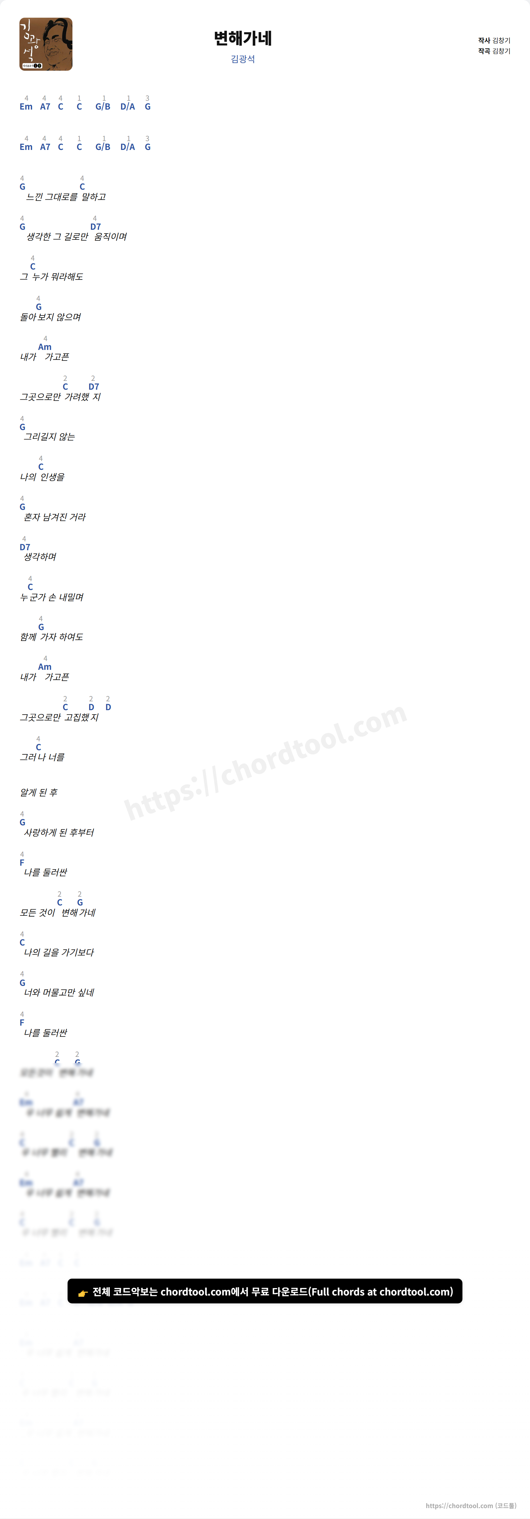 김광석의 변해가네 가사를 확인할 수 있습니다. 곡 정보와 함께 연주에 필요한 코드, 악보 제공 여부도 함께 정리했습니다.
