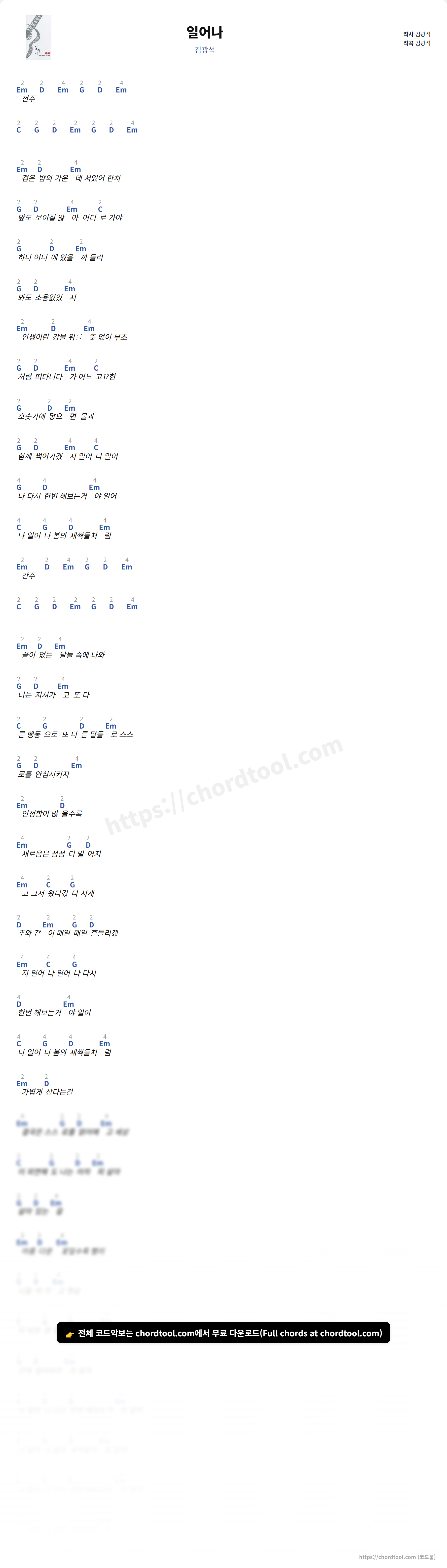 김광석의 "일어나" 가사 페이지입니다. 곡 정보와 함께 코드 진행, 악보 제공 여부를 한눈에 확인할 수 있도록 구성했습니다. 현재 코드악보가 제공되고 있으며 다양한 악기 코드표도 확인 가능합니다. |