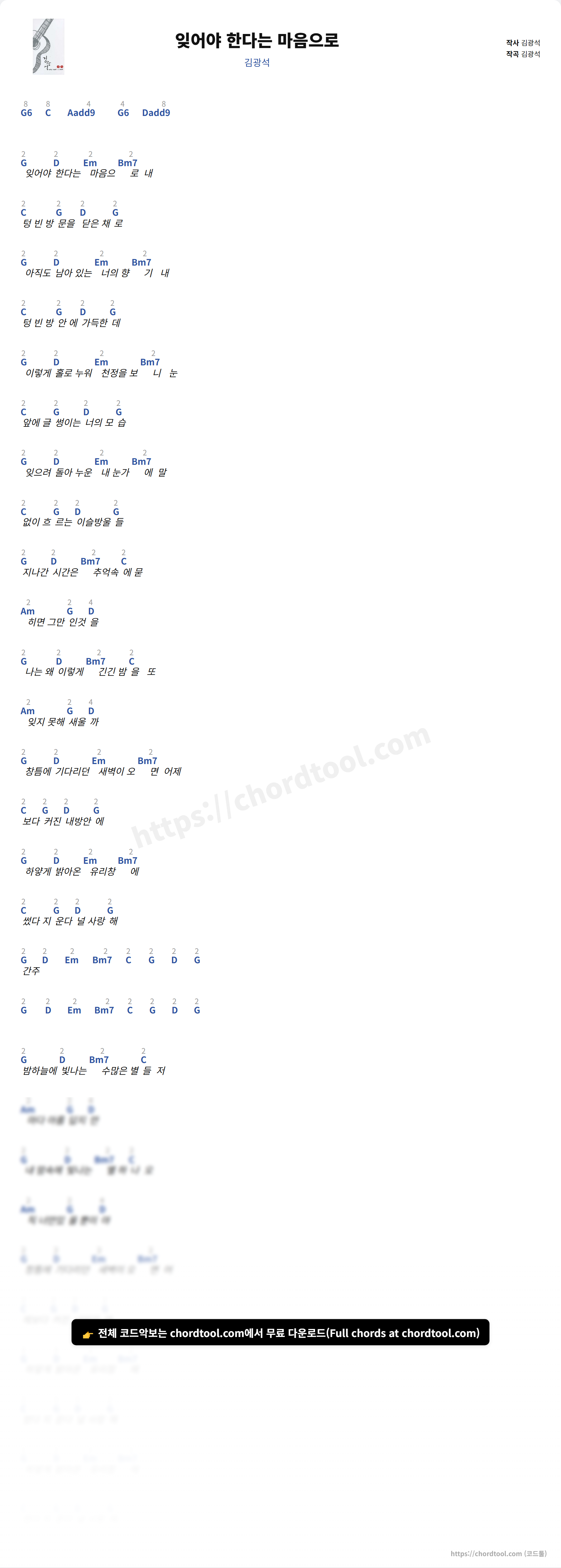 김광석의 잊어야 한다는 마음으로 가사를 확인할 수 있습니다. 곡 정보와 함께 연주에 필요한 코드, 악보 제공 여부도 함께 정리했습니다.