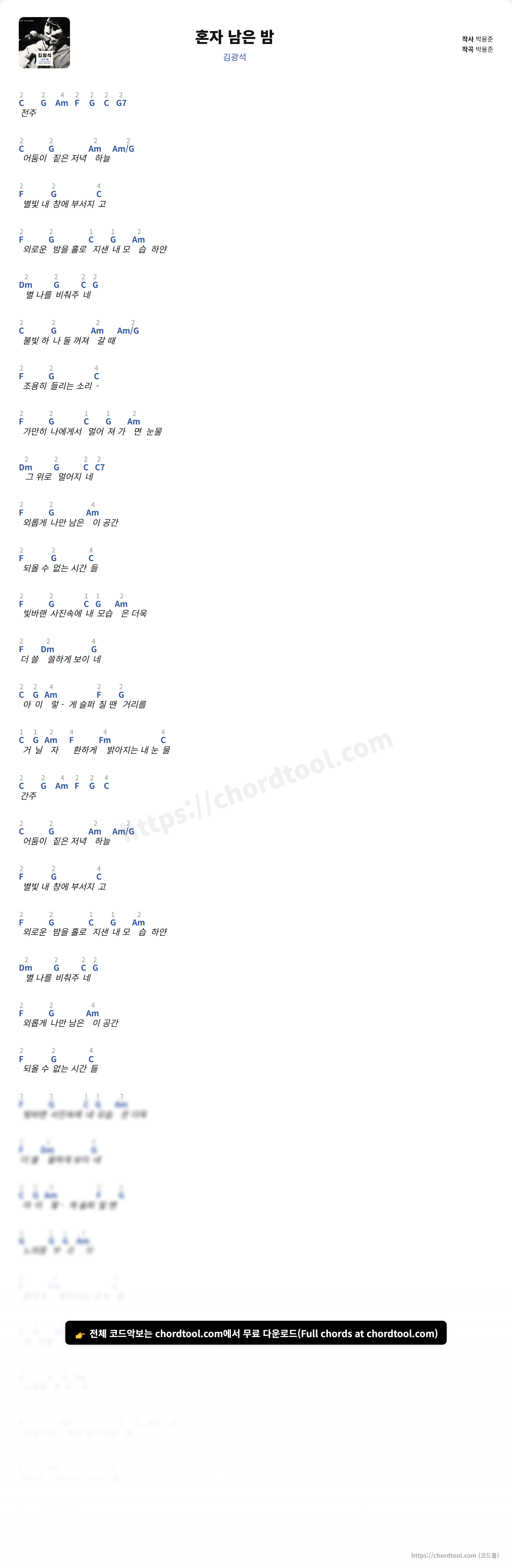 김광석의 "혼자 남은 밤" 가사 페이지입니다. 곡 정보와 함께 코드 진행, 악보 제공 여부를 한눈에 확인할 수 있도록 구성했습니다. 현재 코드악보가 제공되고 있으며 다양한 악기 코드표도 확인 가능합니다. |
