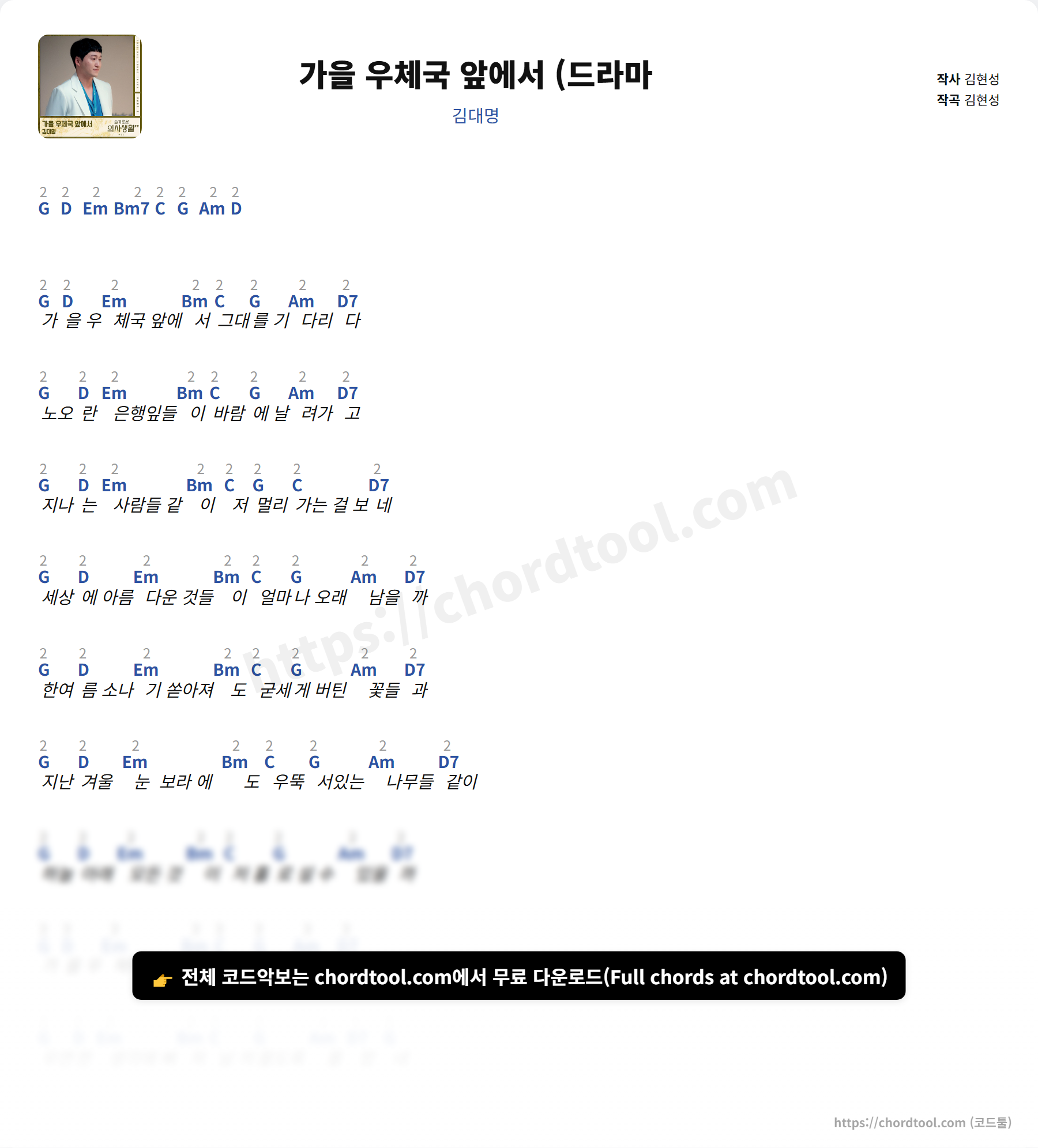 김대명의 "가을 우체국 앞에서 (드라마" 가사 페이지입니다. 곡 정보와 함께 코드 진행, 악보 제공 여부를 한눈에 확인할 수 있도록 구성했습니다. 현재 코드악보가 제공되고 있으며 다양한 악기 코드표도 확인 가능합니다. |