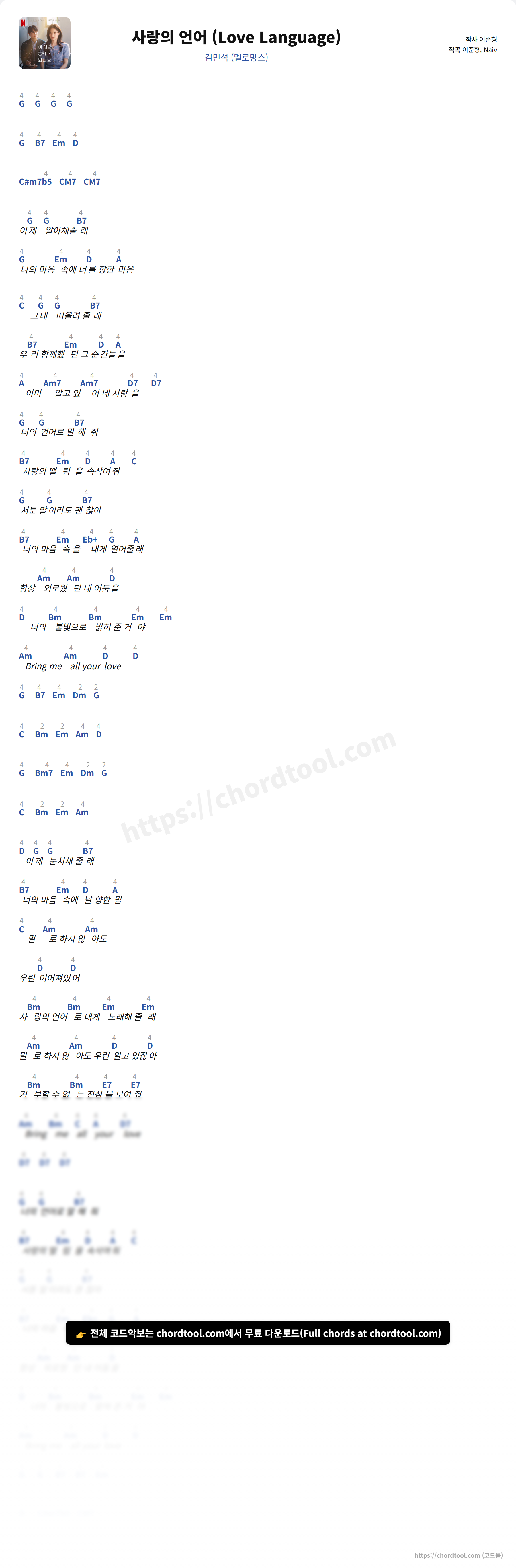 김민석 (멜로망스)의 "사랑의 언어 (Love Language)" 가사 페이지입니다. 곡 정보와 함께 코드 진행, 악보 제공 여부를 한눈에 확인할 수 있도록 구성했습니다. 현재 코드악보가 제공되고 있으며 다양한 악기 코드표도 확인 가능합니다. |