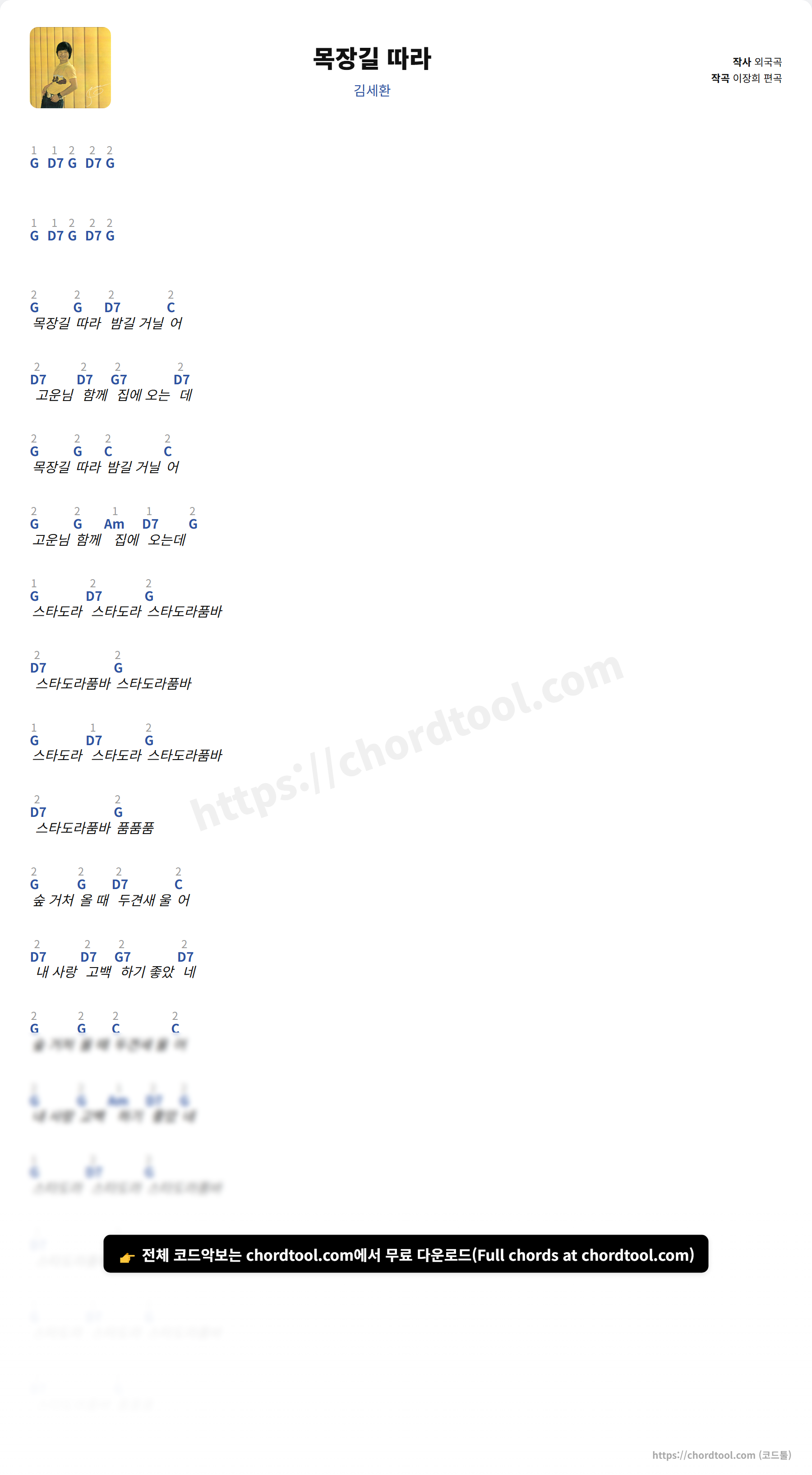 김세환의 목장길 따라 가사를 확인할 수 있습니다. 곡 정보와 함께 연주에 필요한 코드, 악보 제공 여부도 함께 정리했습니다.