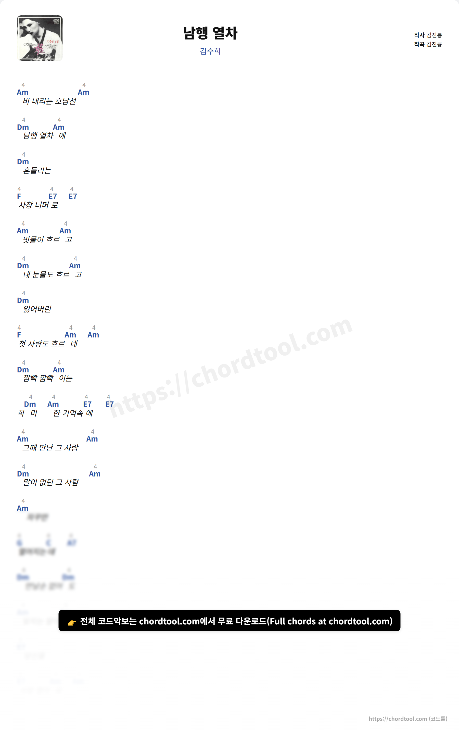김수희의 남행 열차 가사를 확인할 수 있습니다. 곡 정보와 함께 연주에 필요한 코드, 악보 제공 여부도 함께 정리했습니다.