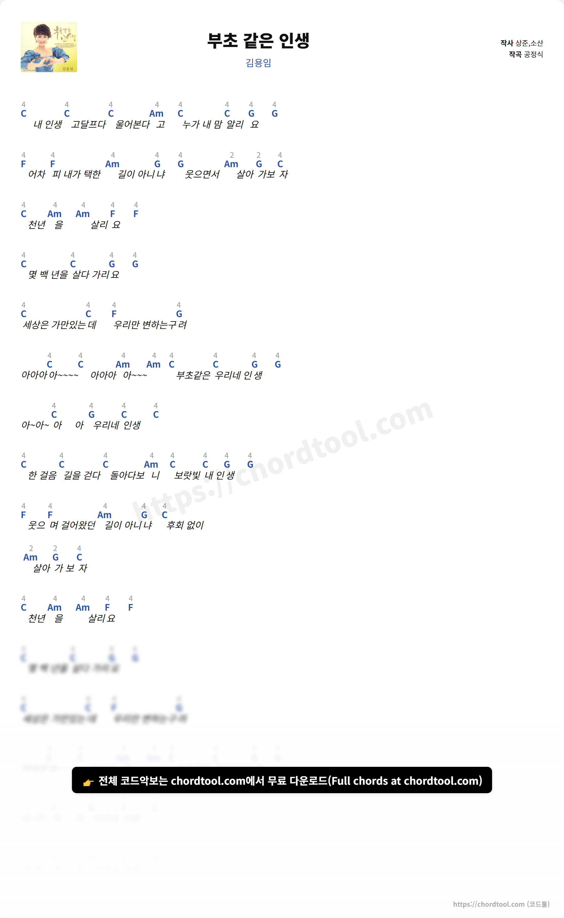 부초 같은 인생는 가사만 찾는 사용자뿐 아니라 기타 코드, 우쿨렐레 코드, 피아노 코드까지 함께 찾는 경우가 많습니다.