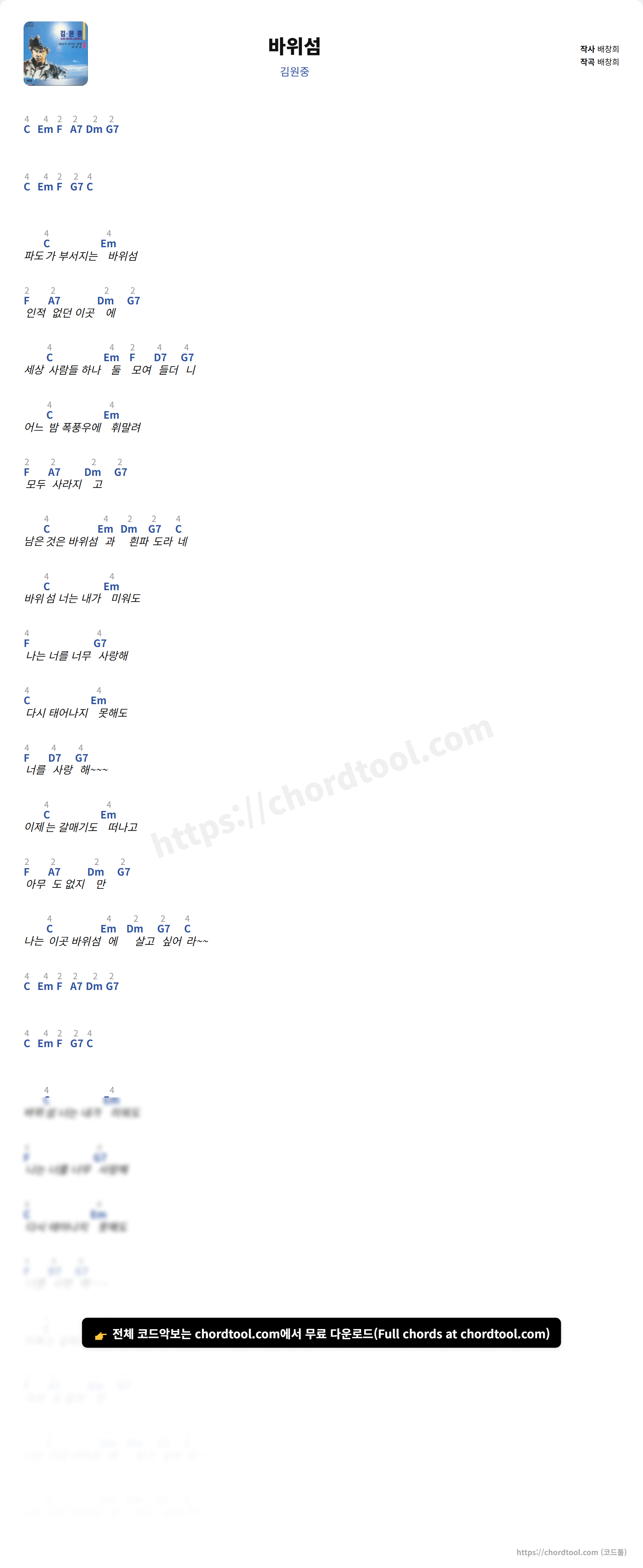 김원중의 바위섬 가사를 확인할 수 있습니다. 곡 정보와 함께 연주에 필요한 코드, 악보 제공 여부도 함께 정리했습니다.