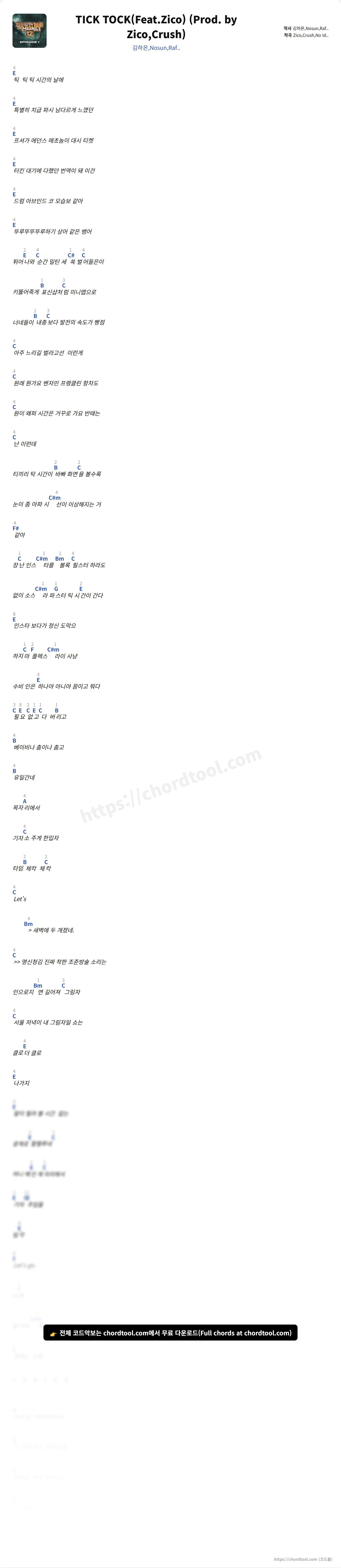 TICK TOCK(Feat.Zico) (Prod. by Zico,Crush)는 가사만 찾는 사용자뿐 아니라 기타 코드, 우쿨렐레 코드, 피아노 코드까지 함께 찾는 경우가 많습니다.