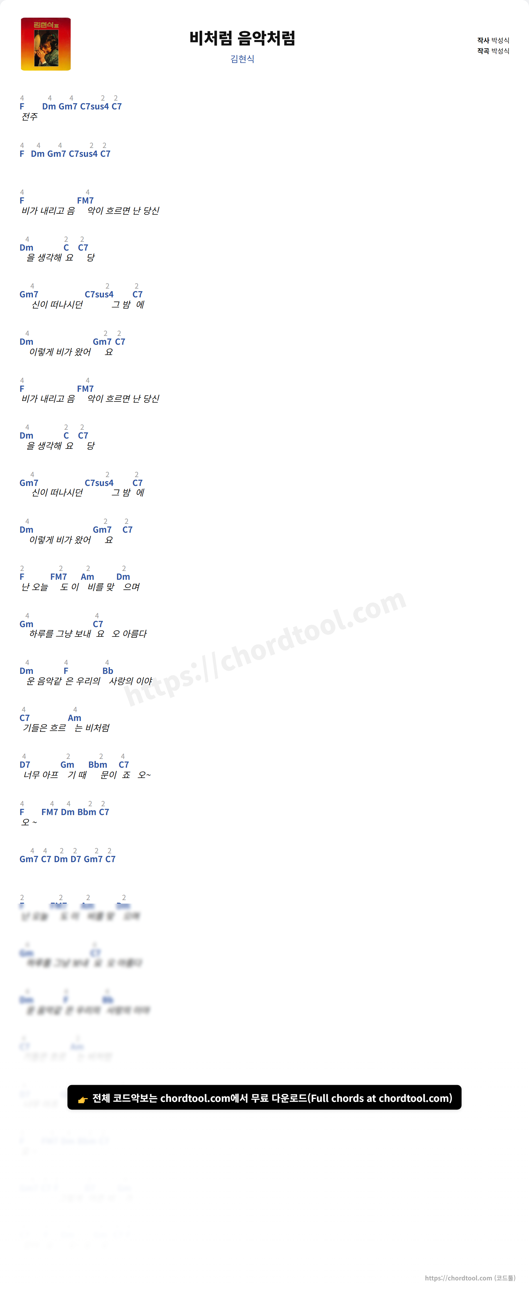 김현식의 비처럼 음악처럼 가사를 확인할 수 있습니다. 곡 정보와 함께 연주에 필요한 코드, 악보 제공 여부도 함께 정리했습니다.