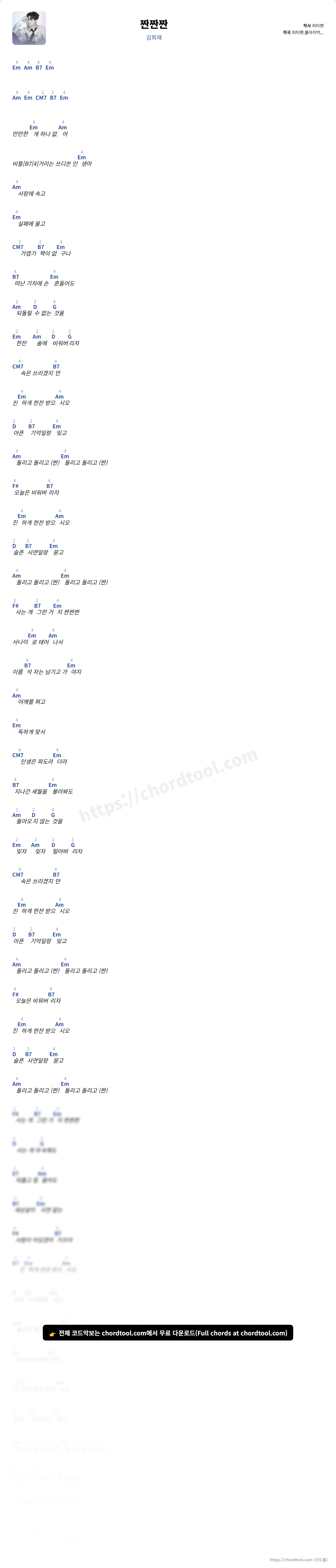 김희재의 짠짠짠 가사를 확인할 수 있습니다. 곡 정보와 함께 연주에 필요한 코드, 악보 제공 여부도 함께 정리했습니다.