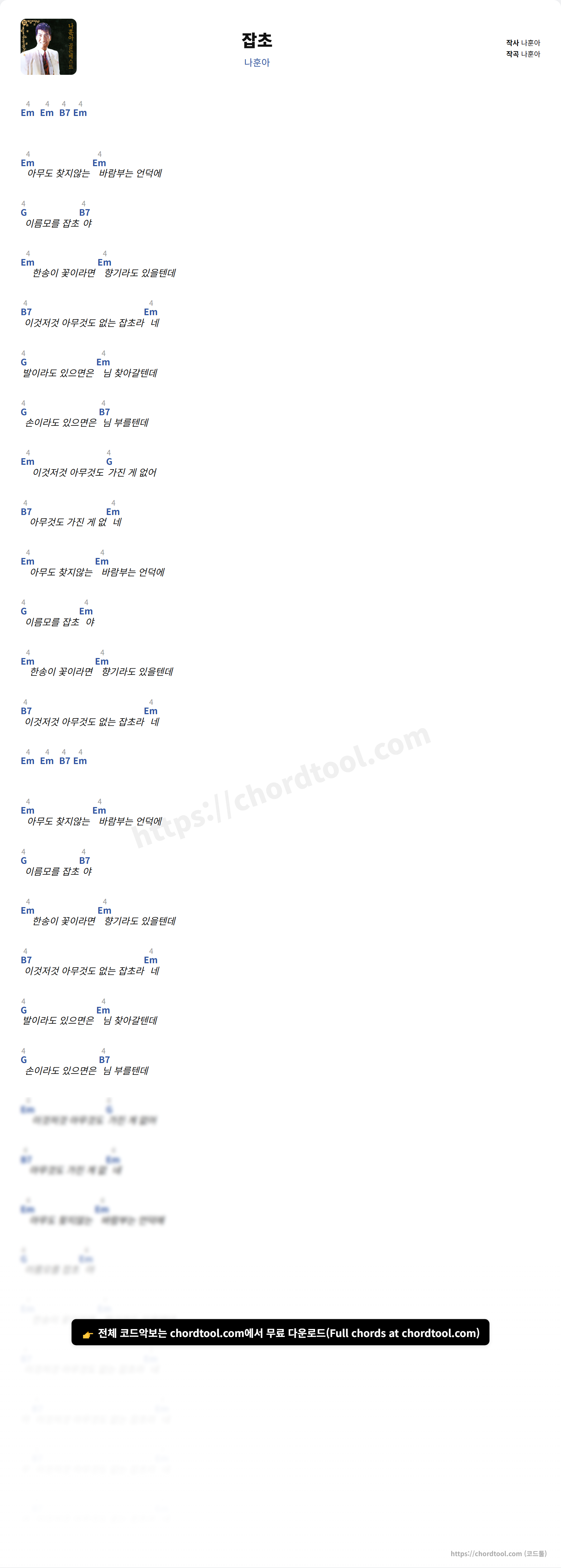 잡초는 가사만 찾는 사용자뿐 아니라 기타 코드, 우쿨렐레 코드, 피아노 코드까지 함께 찾는 경우가 많습니다.