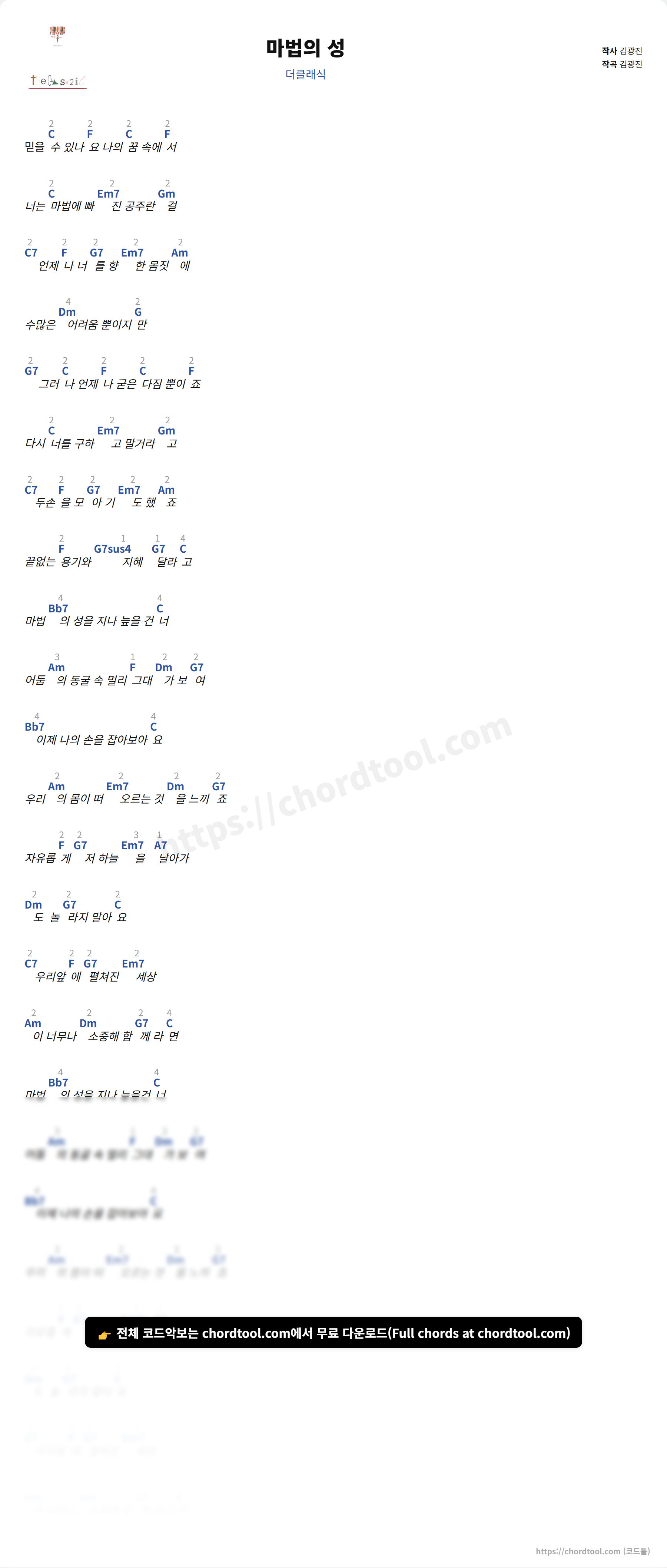 마법의 성는 가사만 찾는 사용자뿐 아니라 기타 코드, 우쿨렐레 코드, 피아노 코드까지 함께 찾는 경우가 많습니다.