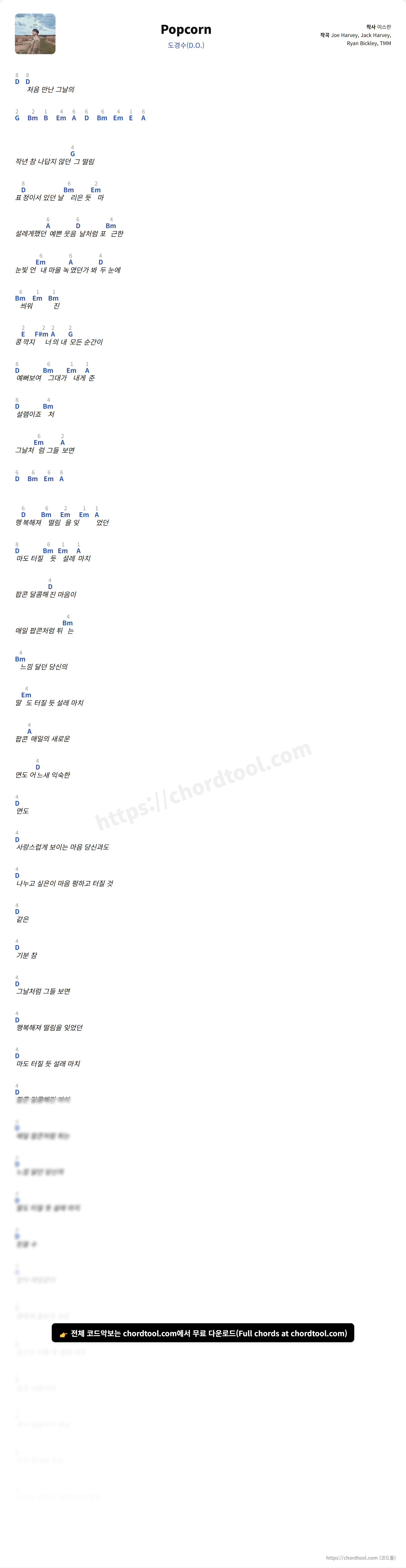 도경수(D.O.)의 "Popcorn" 가사 페이지입니다. 곡 정보와 함께 코드 진행, 악보 제공 여부를 한눈에 확인할 수 있도록 구성했습니다. 원키는 D입니다. 현재 코드악보가 제공되고 있으며 다양한 악기 코드표도 확인 가능합니다. |