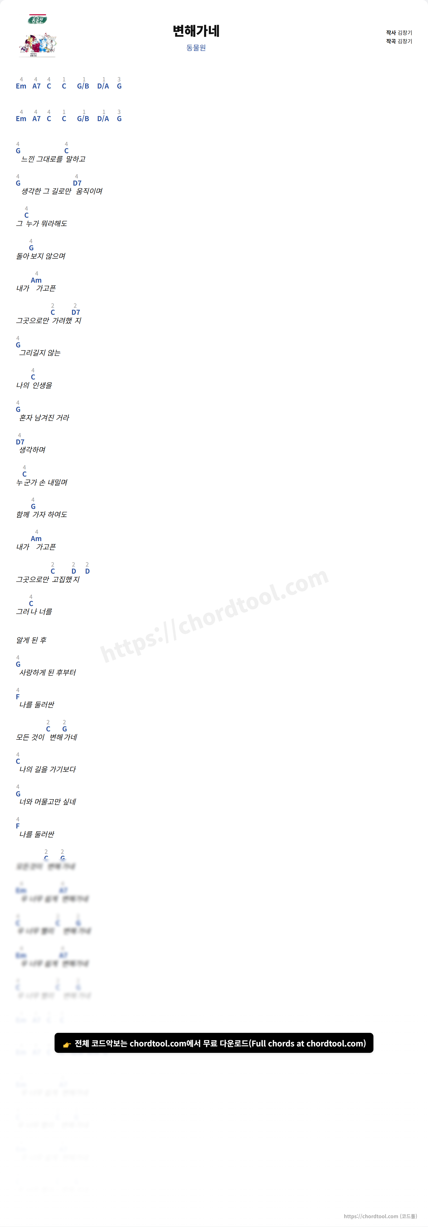 동물원의 변해가네 가사를 확인할 수 있습니다. 곡 정보와 함께 연주에 필요한 코드, 악보 제공 여부도 함께 정리했습니다.