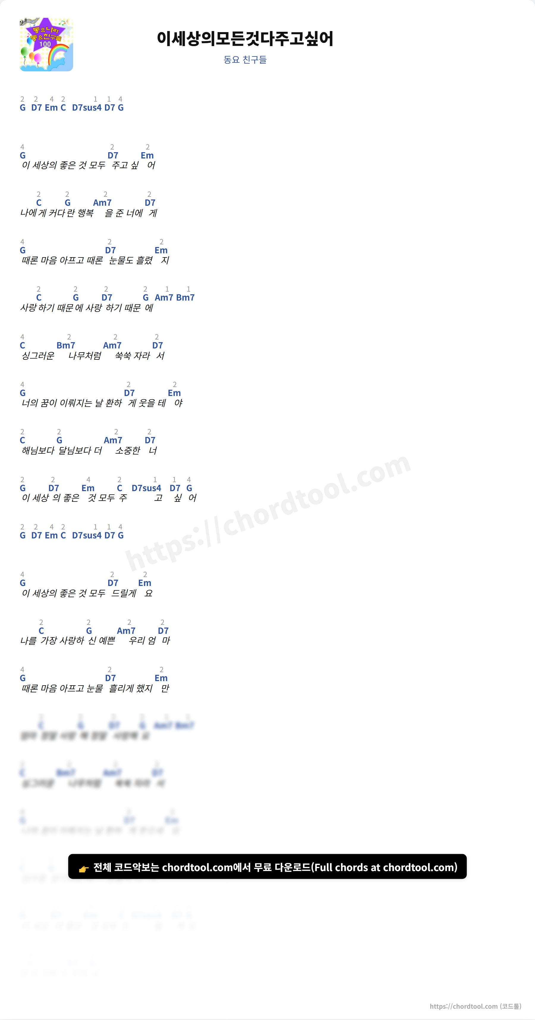 동요 친구들의 이세상의모든것다주고싶어 가사를 확인할 수 있습니다. 곡 정보와 함께 연주에 필요한 코드, 악보 제공 여부도 함께 정리했습니다.