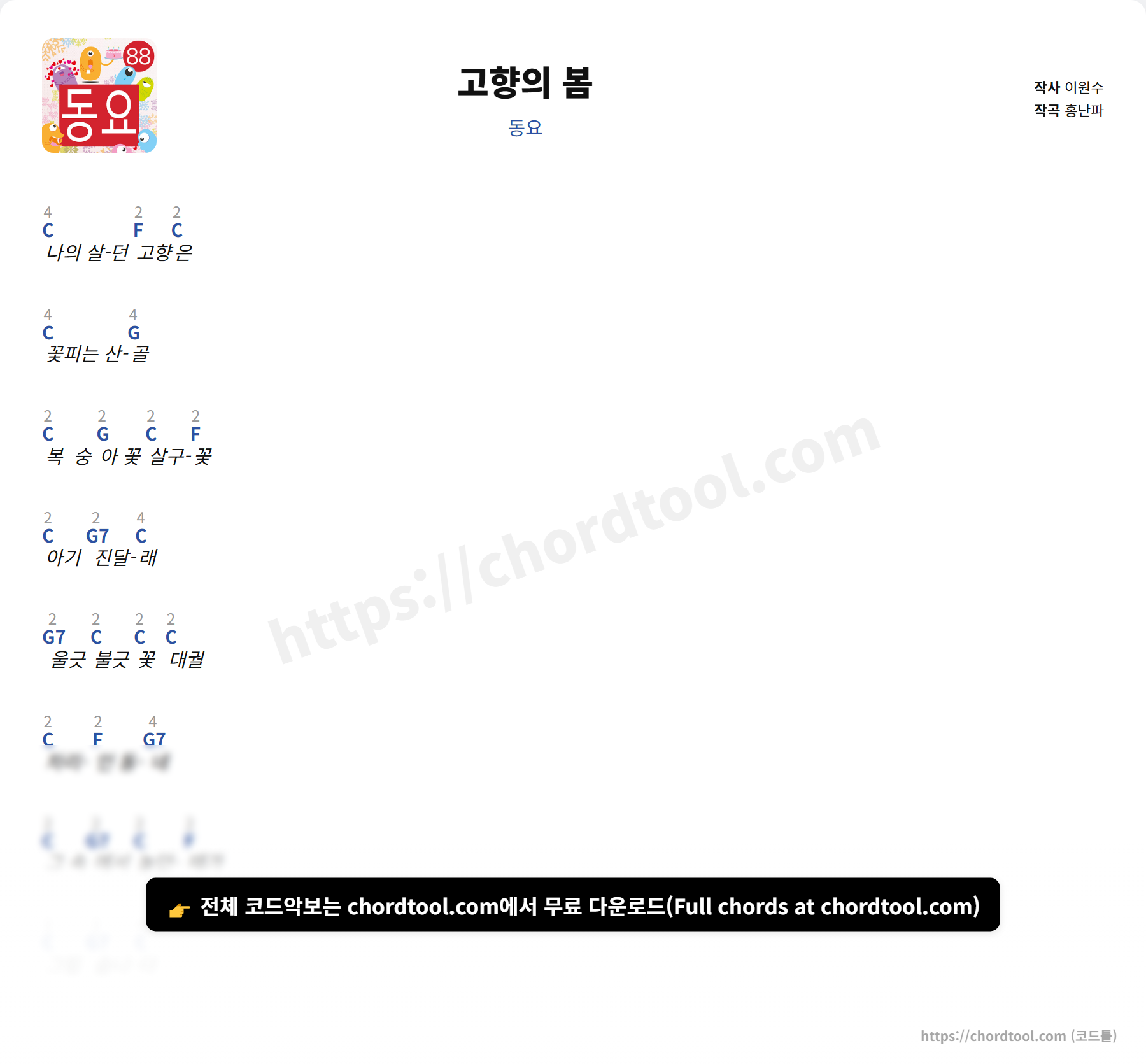고향의 봄는 가사만 찾는 사용자뿐 아니라 기타 코드, 우쿨렐레 코드, 피아노 코드까지 함께 찾는 경우가 많습니다.