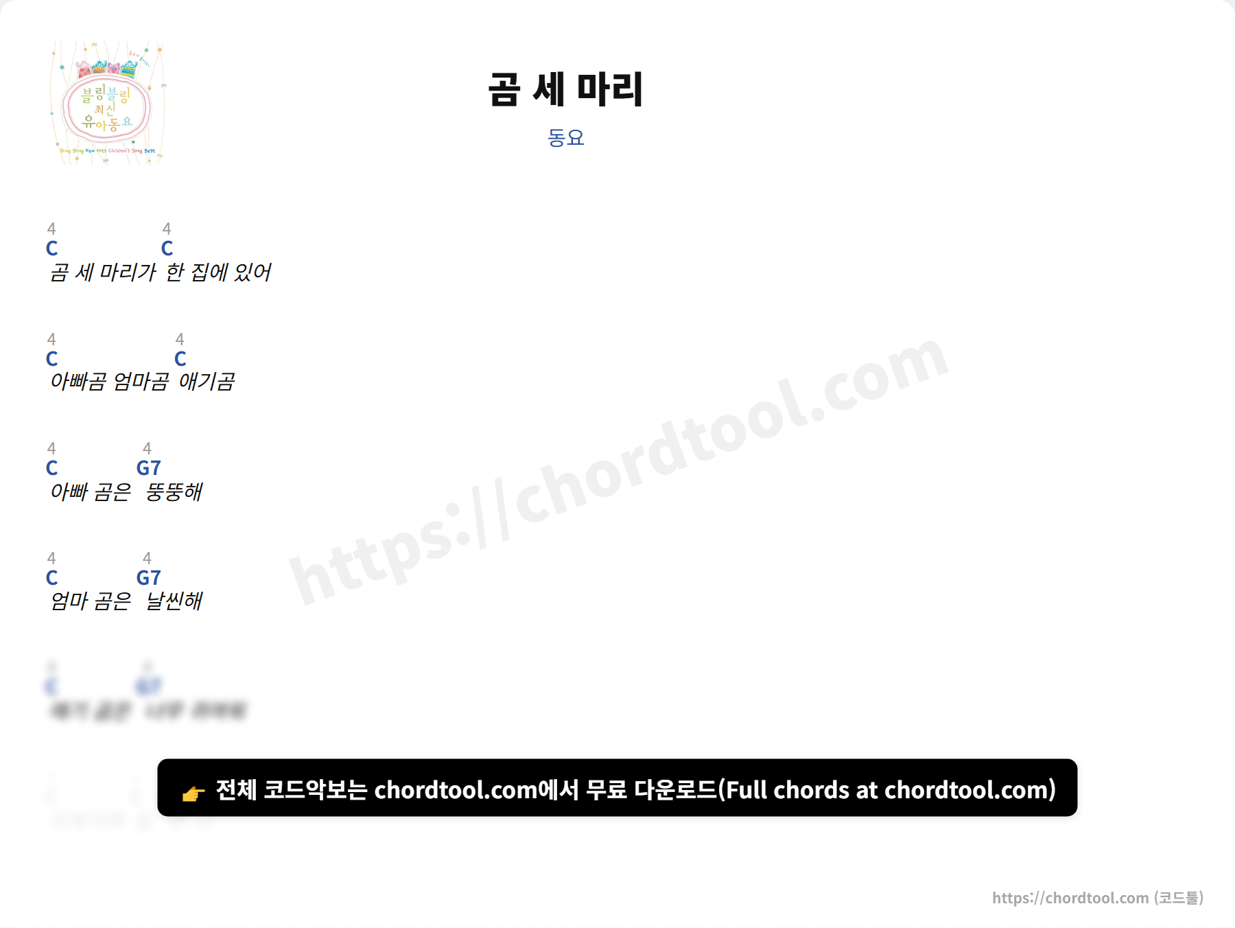 동요의 곰 세 마리 가사를 확인할 수 있습니다. 곡 정보와 함께 연주에 필요한 코드, 악보 제공 여부도 함께 정리했습니다.
