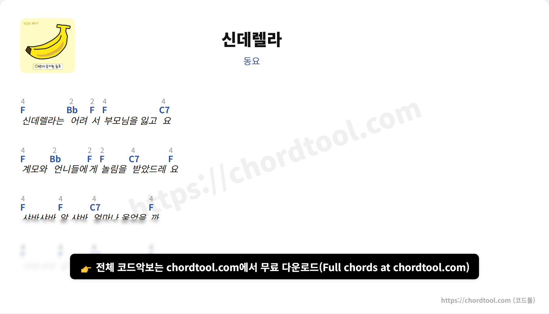 동요의 신데렐라 가사를 확인할 수 있습니다. 곡 정보와 함께 연주에 필요한 코드, 악보 제공 여부도 함께 정리했습니다.