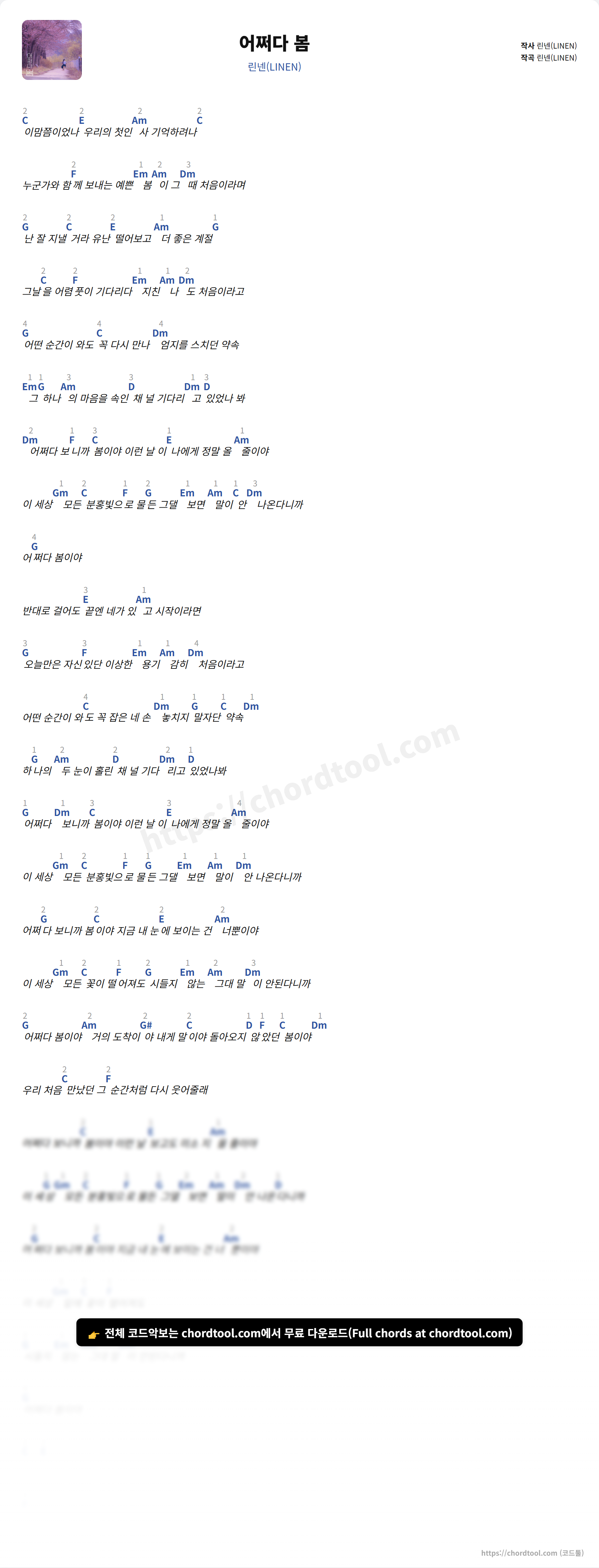 린넨(LINEN)의 어쩌다 봄 가사를 확인할 수 있습니다. 곡 정보와 함께 연주에 필요한 코드, 악보 제공 여부도 함께 정리했습니다.