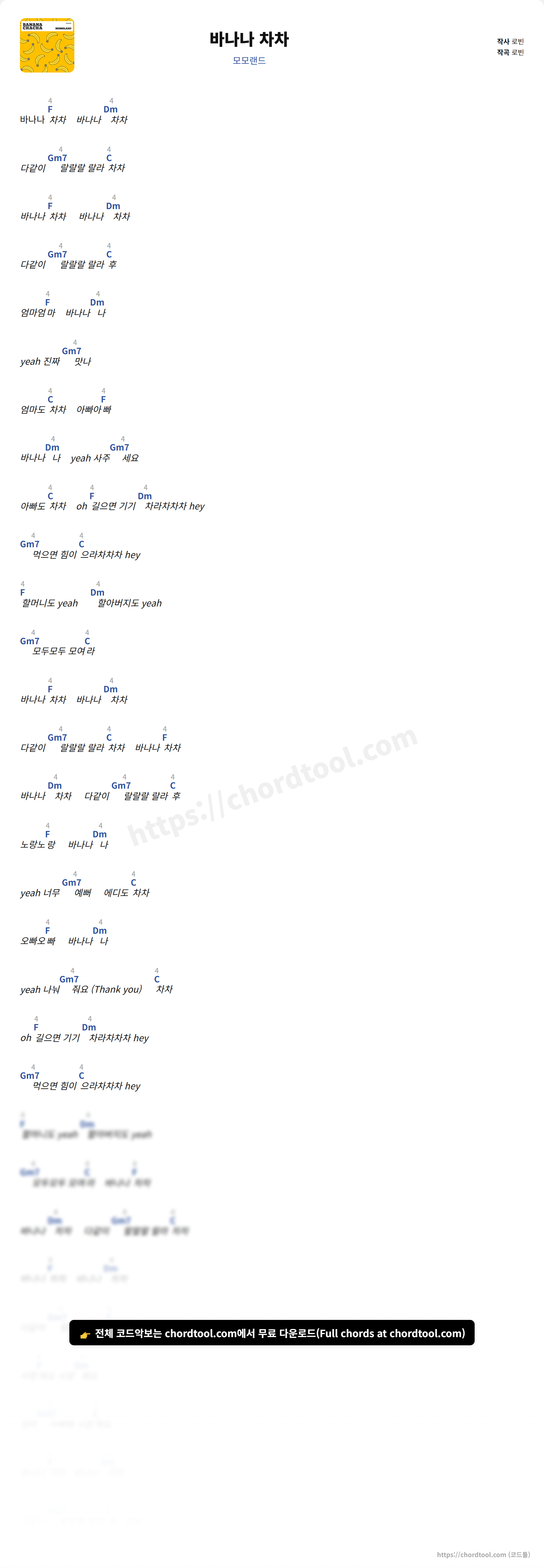 모모랜드의 바나나 차차 가사를 확인할 수 있습니다. 곡 정보와 함께 연주에 필요한 코드, 악보 제공 여부도 함께 정리했습니다.