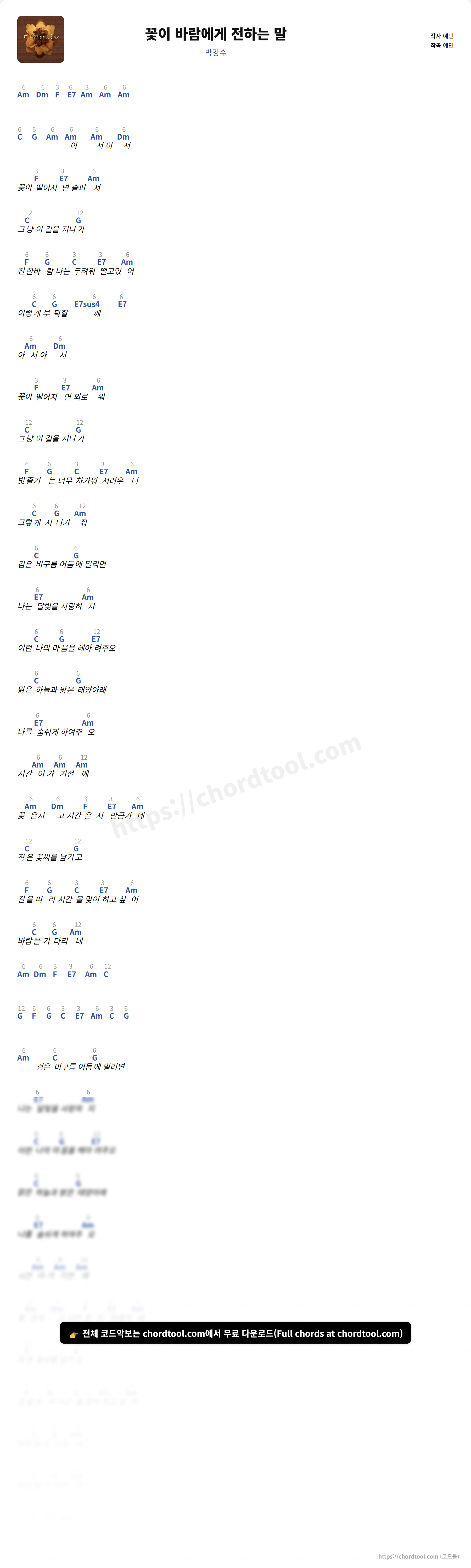 박강수의 "꽃이 바람에게 전하는 말" 가사 페이지입니다. 곡 정보와 함께 코드 진행, 악보 제공 여부를 한눈에 확인할 수 있도록 구성했습니다. 원키는 Am입니다. 남자키 Am, 여자키 Dm 정보도 함께 제공합니다. 현재 코드악보가 제공되고 있으며 다양한 악기 코드표도 확인 가능합니다. |