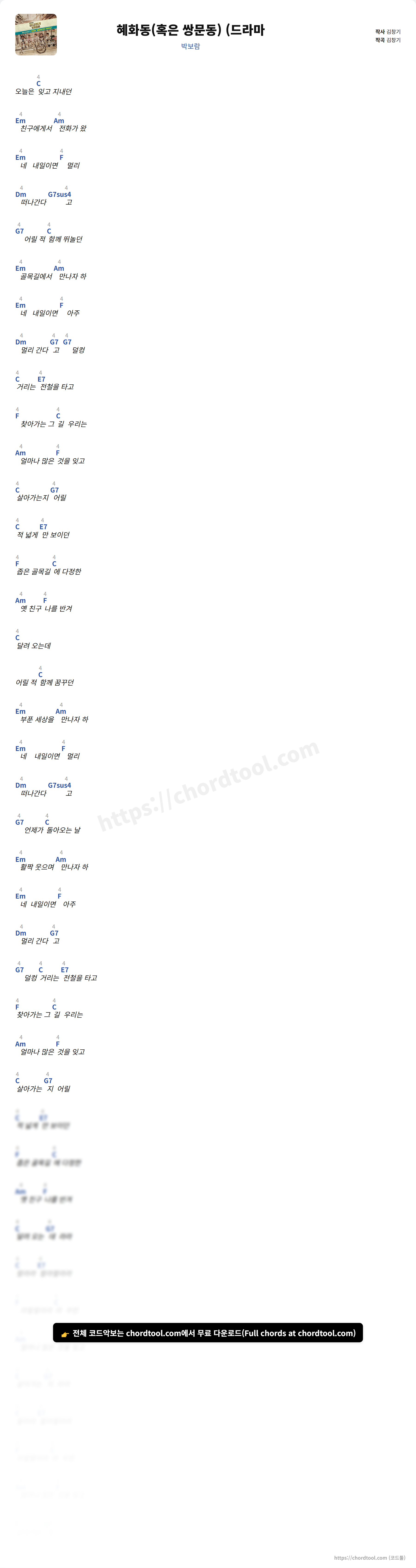 혜화동(혹은 쌍문동) (드라마는 가사만 찾는 사용자뿐 아니라 기타 코드, 우쿨렐레 코드, 피아노 코드까지 함께 찾는 경우가 많습니다.