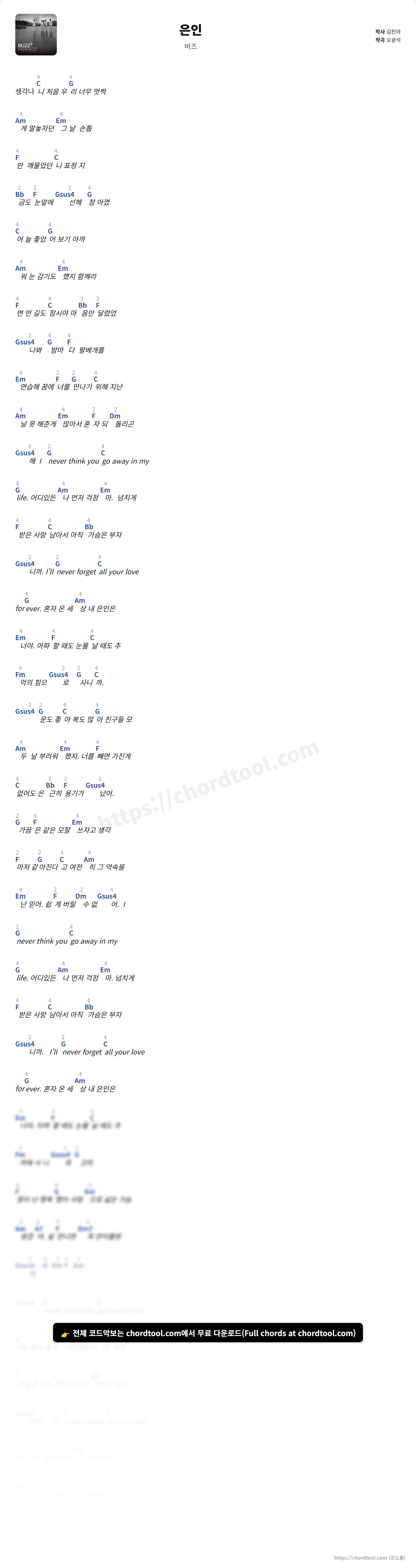 버즈의 은인 가사를 확인할 수 있습니다. 곡 정보와 함께 연주에 필요한 코드, 악보 제공 여부도 함께 정리했습니다.
