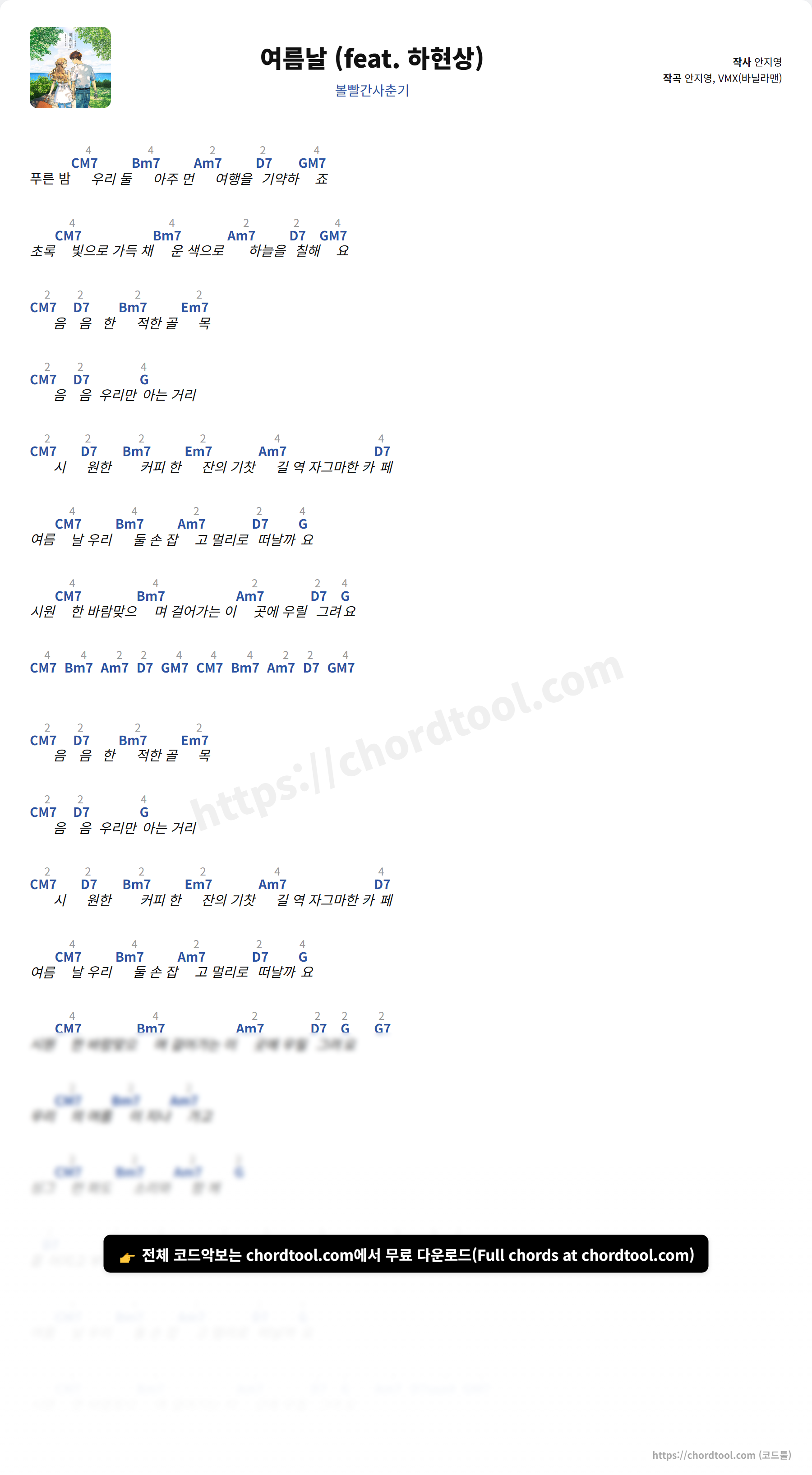 여름날 (feat. 하현상)는 가사만 찾는 사용자뿐 아니라 기타 코드, 우쿨렐레 코드, 피아노 코드까지 함께 찾는 경우가 많습니다.