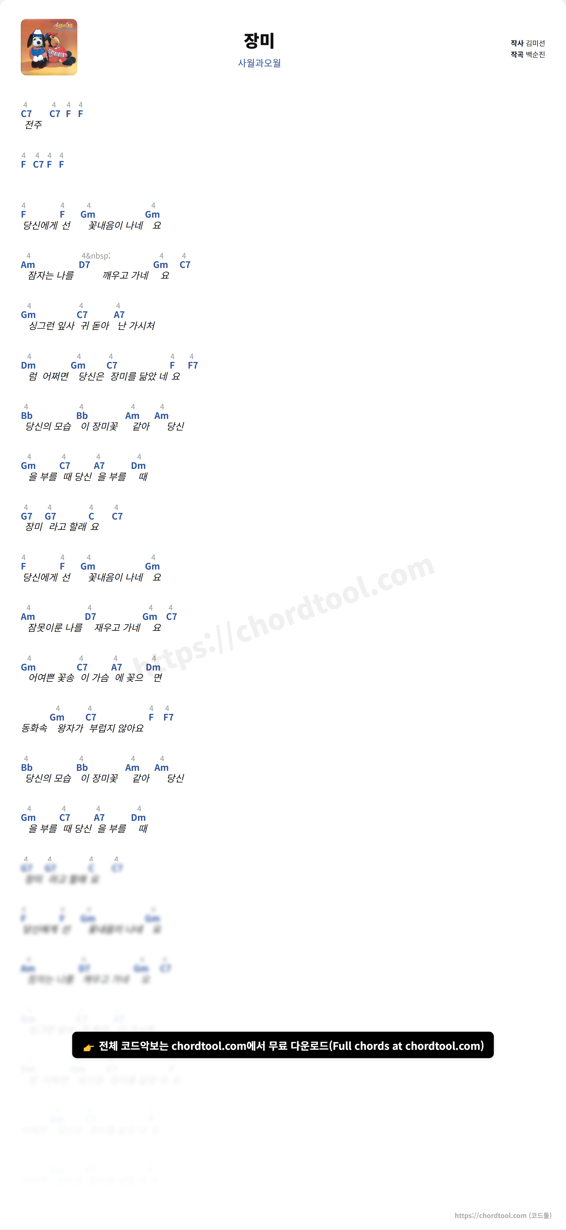 장미는 가사만 찾는 사용자뿐 아니라 기타 코드, 우쿨렐레 코드, 피아노 코드까지 함께 찾는 경우가 많습니다.