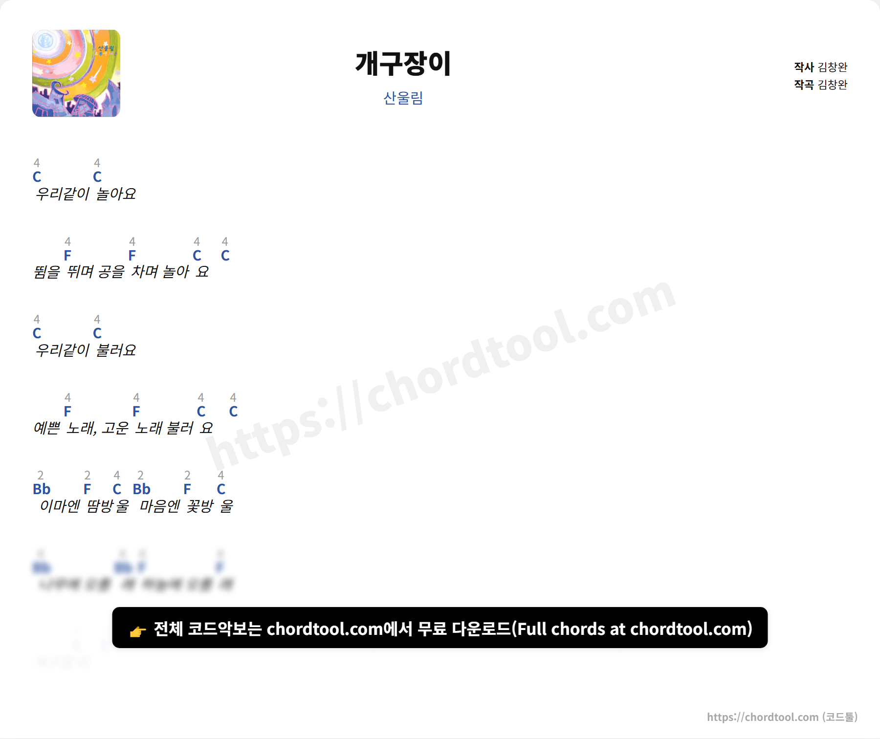 개구장이는 가사만 찾는 사용자뿐 아니라 기타 코드, 우쿨렐레 코드, 피아노 코드까지 함께 찾는 경우가 많습니다.