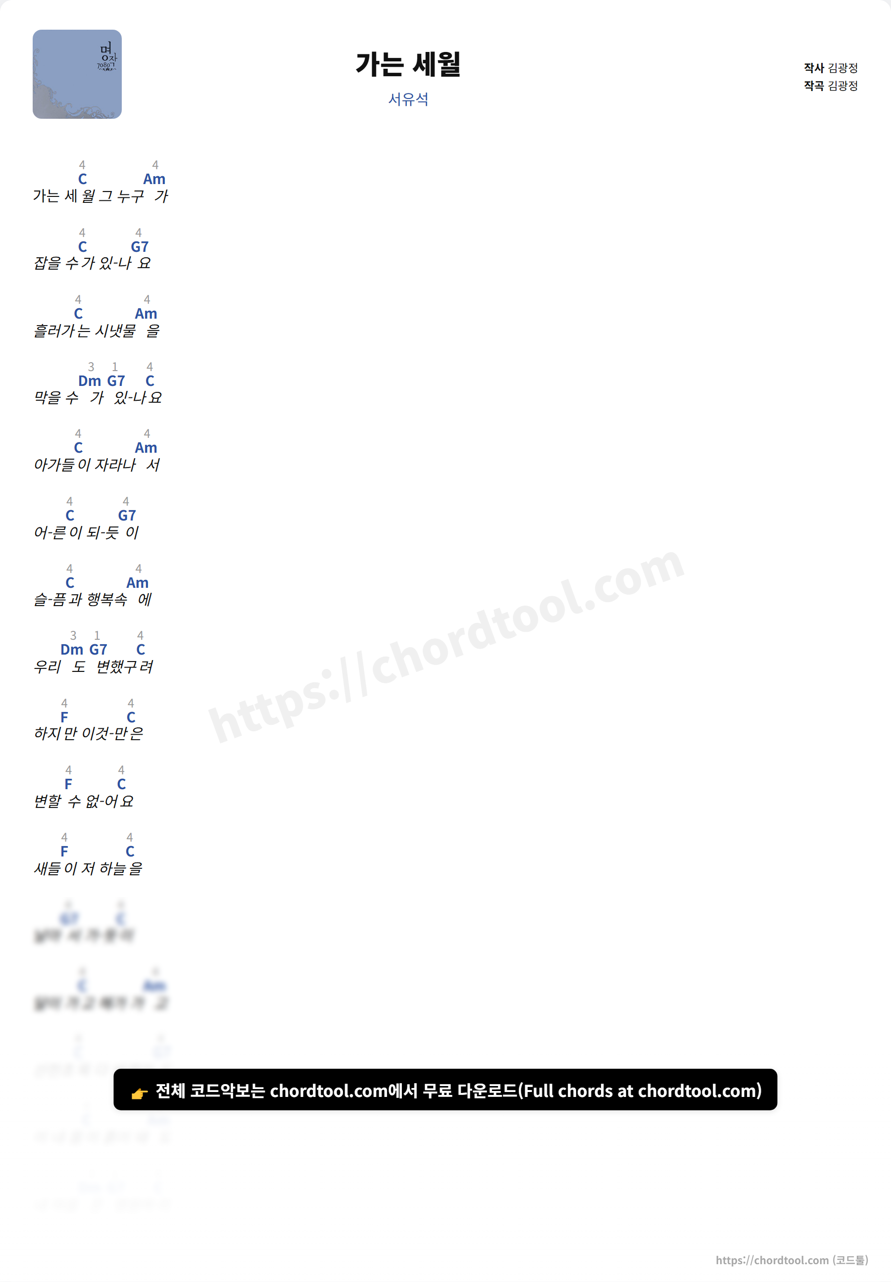 서유석의 가는 세월 가사를 확인할 수 있습니다. 곡 정보와 함께 연주에 필요한 코드, 악보 제공 여부도 함께 정리했습니다.