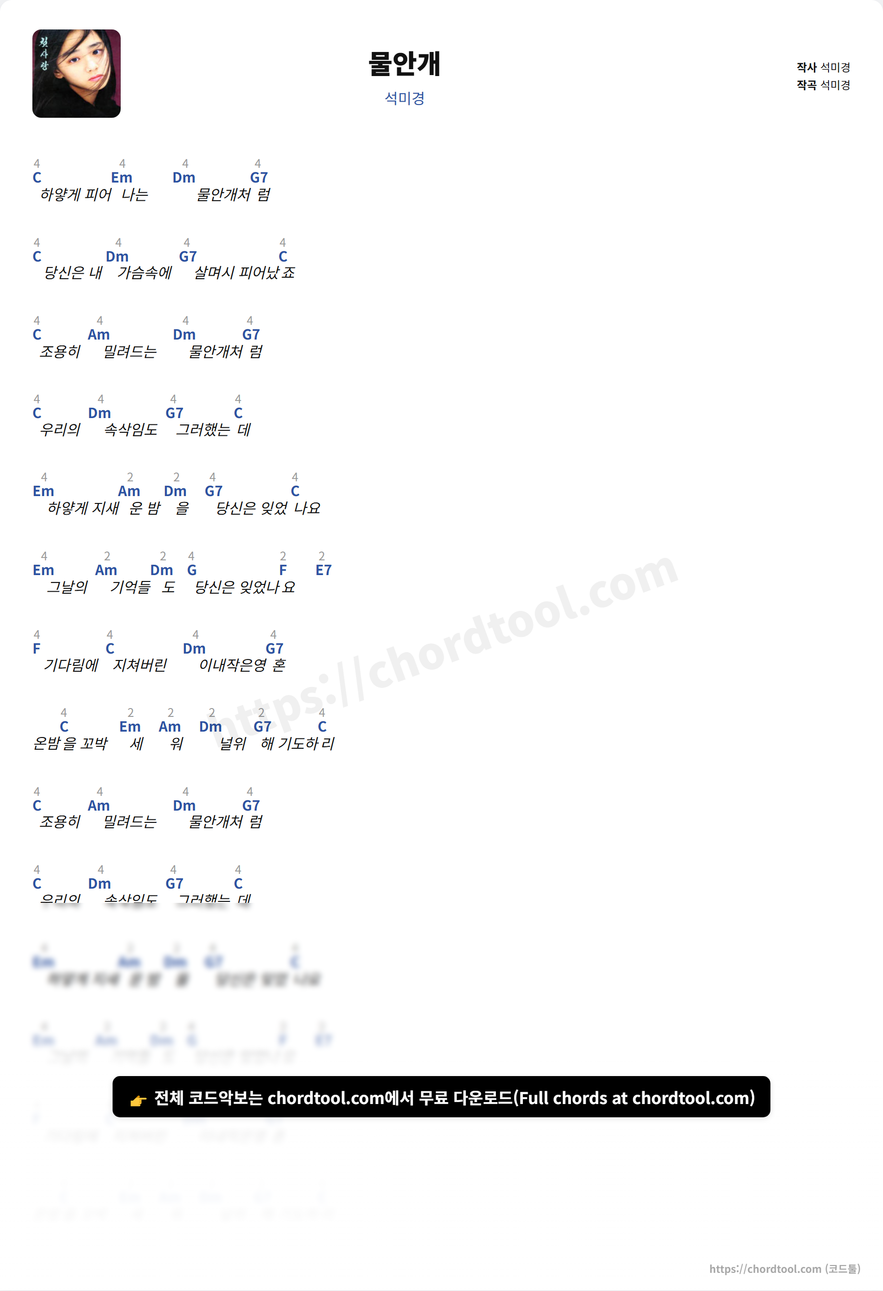 석미경의 물안개 가사를 확인할 수 있습니다. 곡 정보와 함께 연주에 필요한 코드, 악보 제공 여부도 함께 정리했습니다.