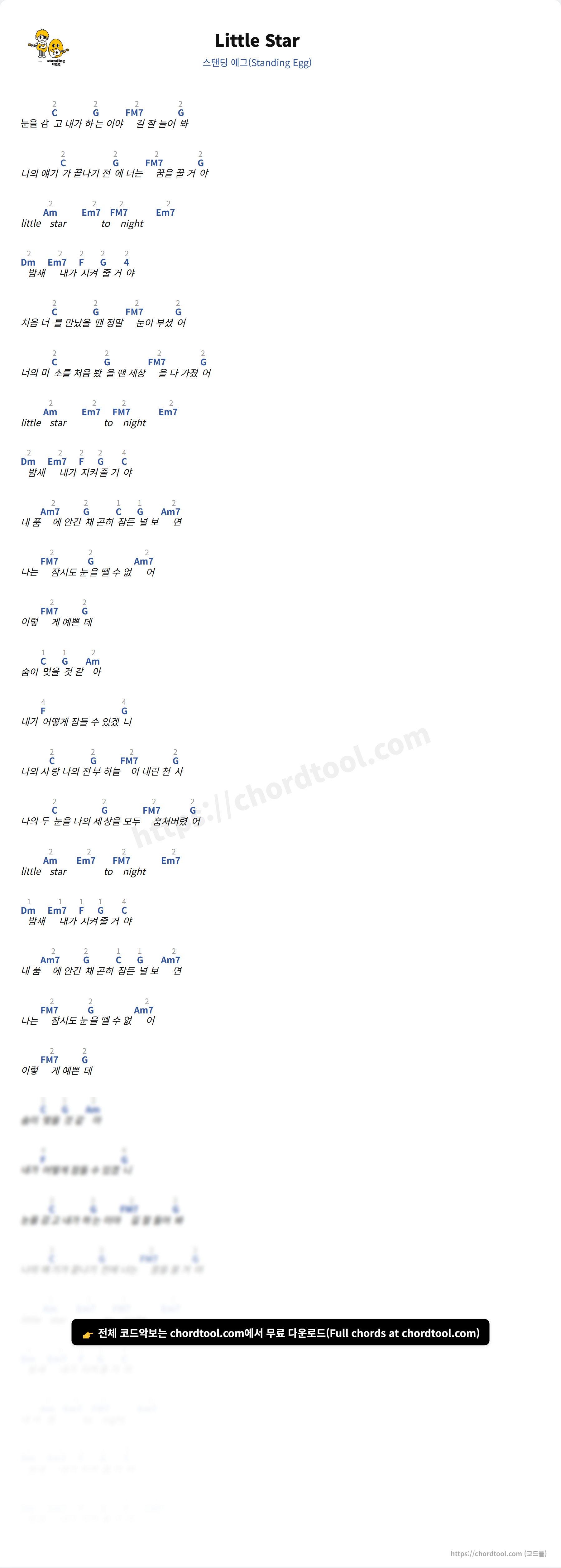 스탠딩 에그(Standing Egg)의 "Little Star" 가사 페이지입니다. 곡 정보와 함께 코드 진행, 악보 제공 여부를 한눈에 확인할 수 있도록 구성했습니다. 현재 코드악보가 제공되고 있으며 다양한 악기 코드표도 확인 가능합니다. |