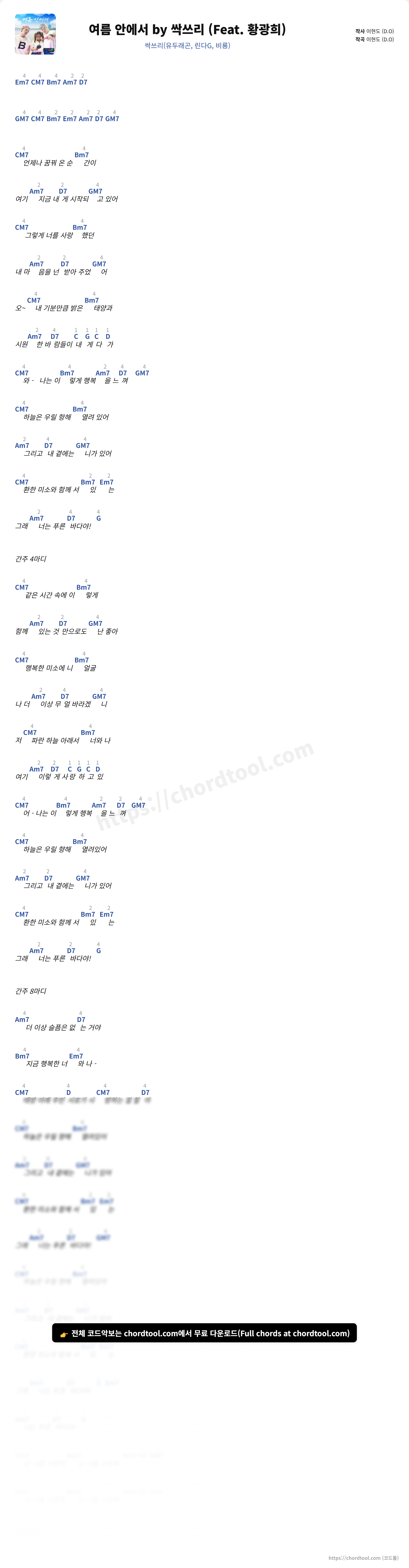 여름 안에서 by 싹쓰리 (Feat. 황광희)는 가사만 찾는 사용자뿐 아니라 기타 코드, 우쿨렐레 코드, 피아노 코드까지 함께 찾는 경우가 많습니다.
