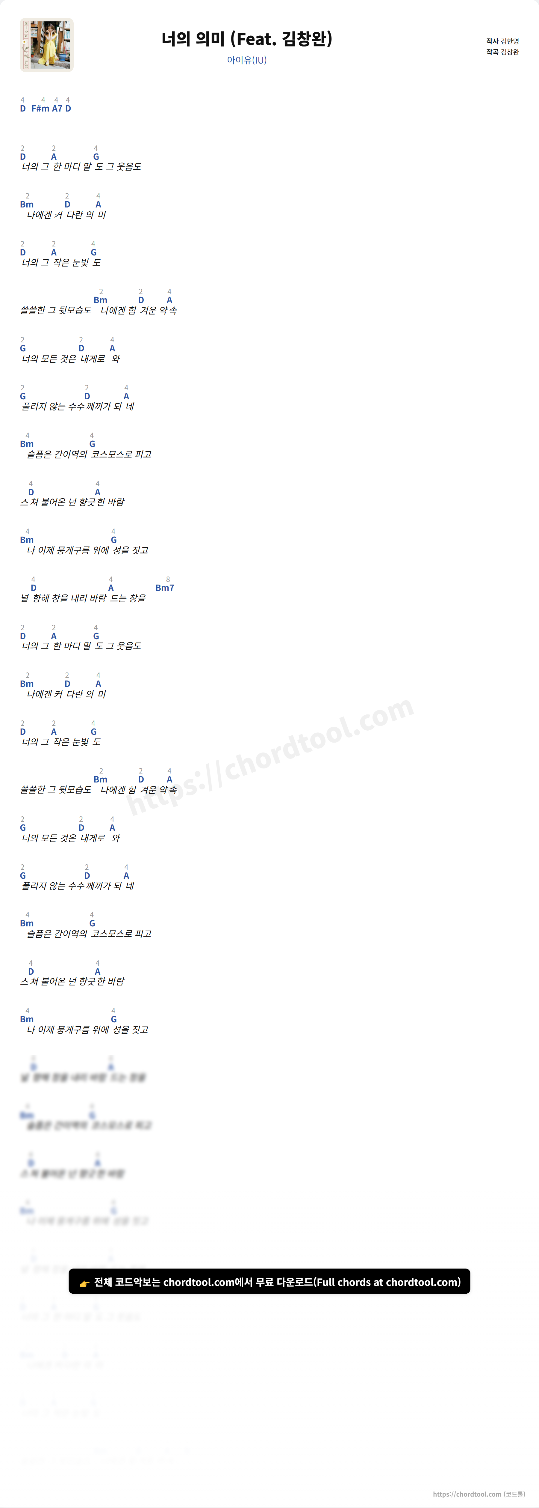 아이유(IU)의 "너의 의미 (Feat. 김창완)" 가사 페이지입니다. 곡 정보와 함께 코드 진행, 악보 제공 여부를 한눈에 확인할 수 있도록 구성했습니다. 현재 코드악보가 제공되고 있으며 다양한 악기 코드표도 확인 가능합니다. |