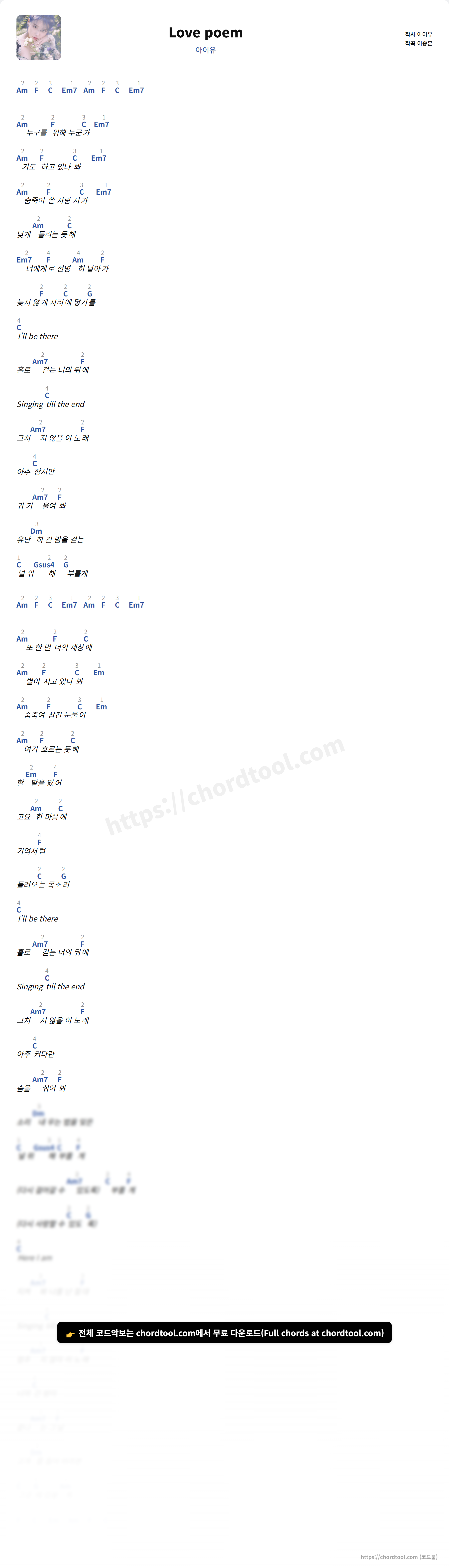 아이유의 Love poem 가사를 확인할 수 있습니다. 곡 정보와 함께 연주에 필요한 코드, 악보 제공 여부도 함께 정리했습니다.