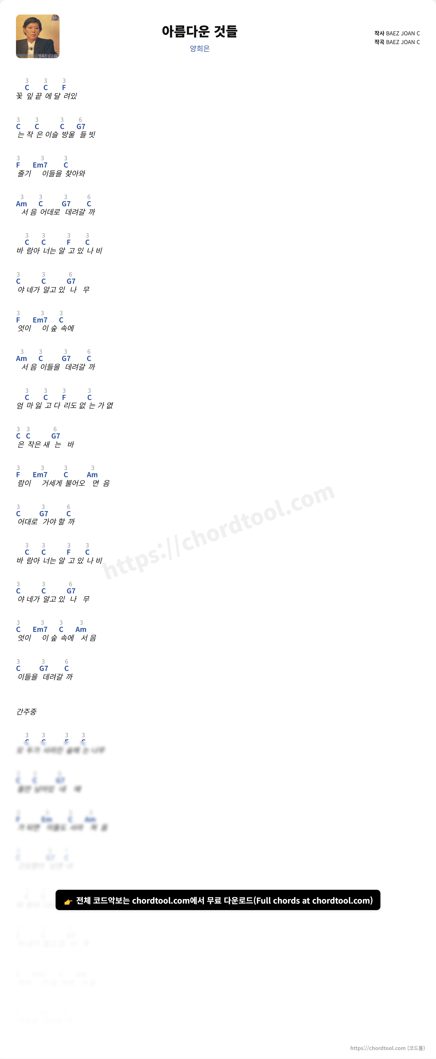양희은의 "아름다운 것들" 가사 페이지입니다. 곡 정보와 함께 코드 진행, 악보 제공 여부를 한눈에 확인할 수 있도록 구성했습니다. 현재 코드악보가 제공되고 있으며 다양한 악기 코드표도 확인 가능합니다. |