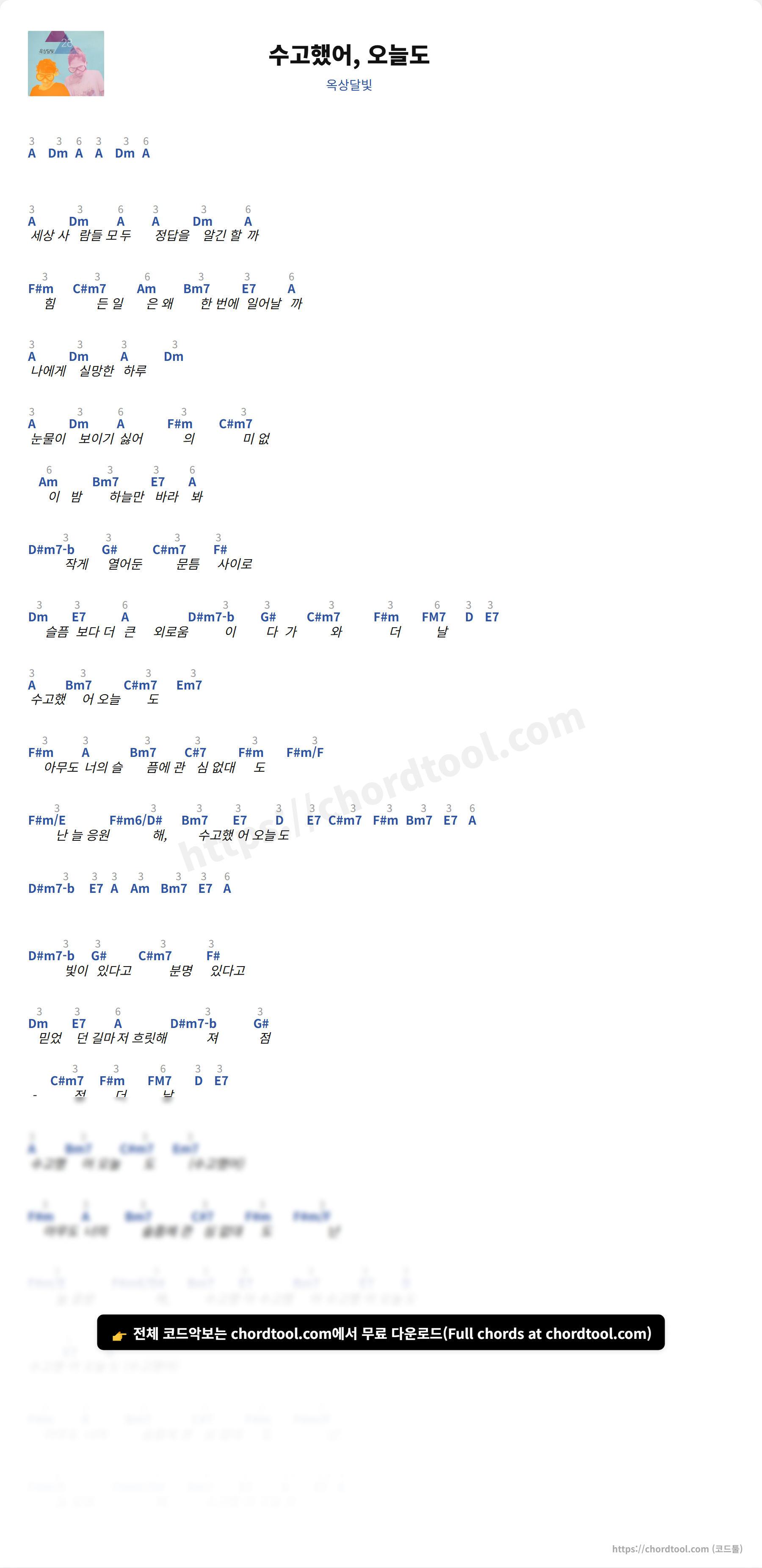 수고했어, 오늘도는 가사만 찾는 사용자뿐 아니라 기타 코드, 우쿨렐레 코드, 피아노 코드까지 함께 찾는 경우가 많습니다.