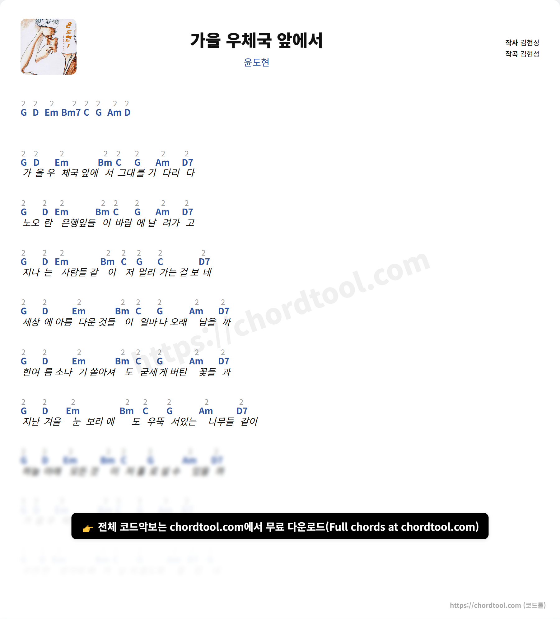 윤도현의 "가을 우체국 앞에서" 가사 페이지입니다. 곡 정보와 함께 코드 진행, 악보 제공 여부를 한눈에 확인할 수 있도록 구성했습니다. 현재 코드악보가 제공되고 있으며 다양한 악기 코드표도 확인 가능합니다. |