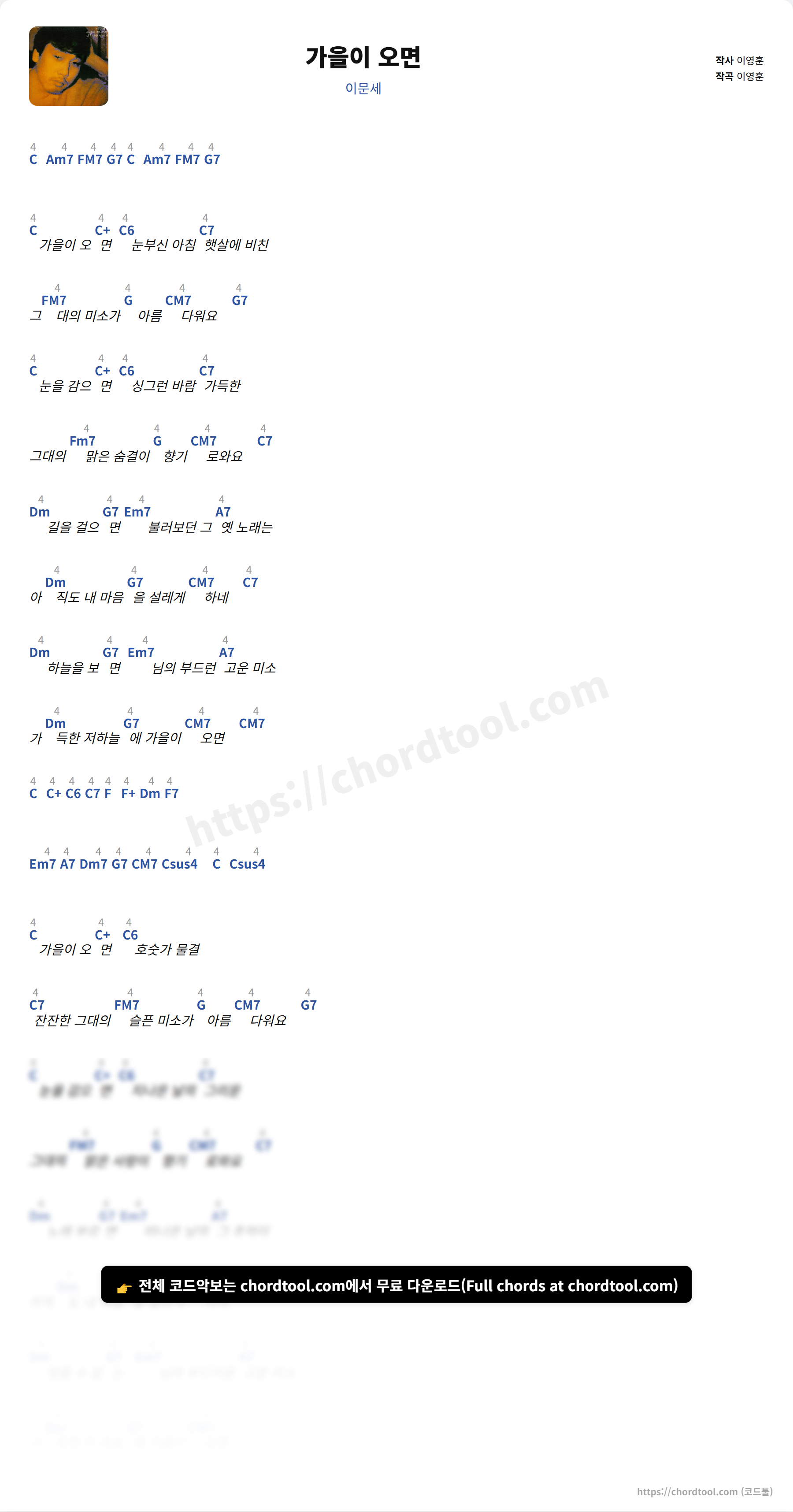 이문세의 가을이 오면 가사를 확인할 수 있습니다. 곡 정보와 함께 연주에 필요한 코드, 악보 제공 여부도 함께 정리했습니다.