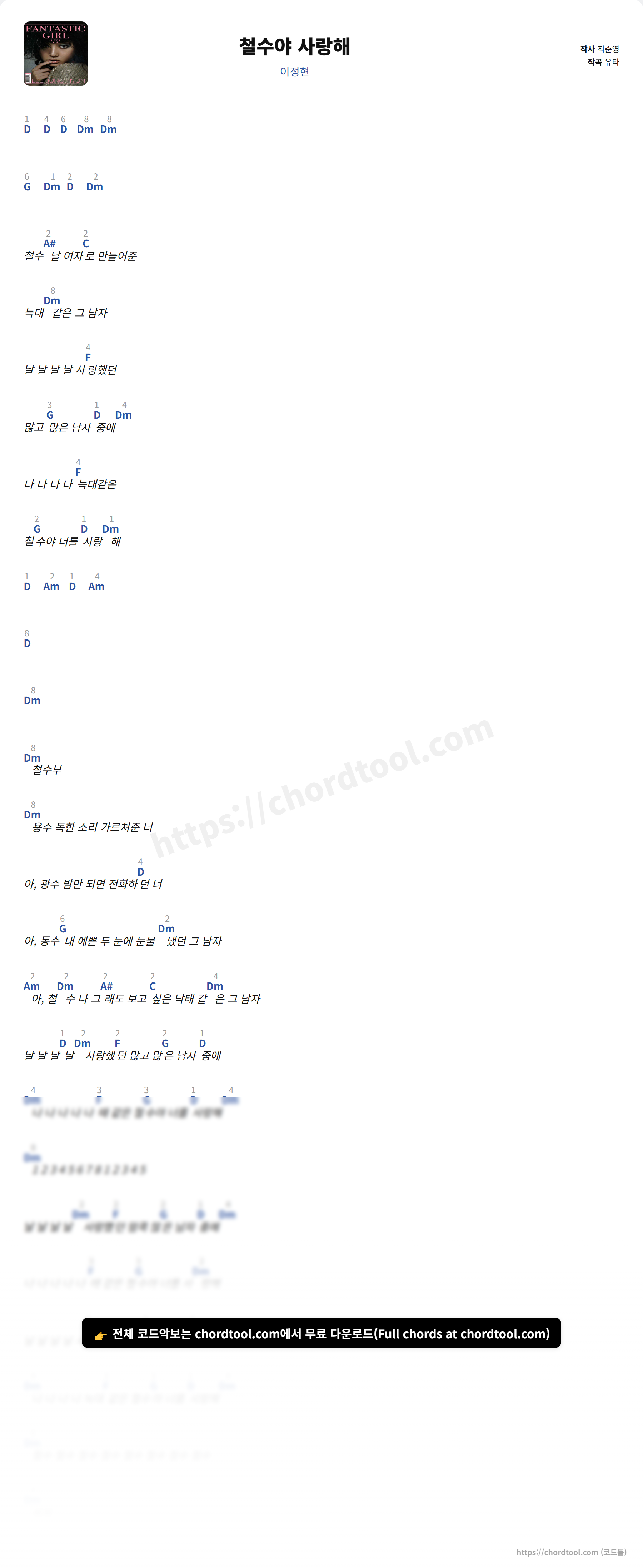 이정현의 "철수야 사랑해" 가사 페이지입니다. 곡 정보와 함께 코드 진행, 악보 제공 여부를 한눈에 확인할 수 있도록 구성했습니다. 원키는 Dm입니다. 남자키 Gm, 여자키 Cm 정보도 함께 제공합니다. 현재 코드악보가 제공되고 있으며 다양한 악기 코드표도 확인 가능합니다. |