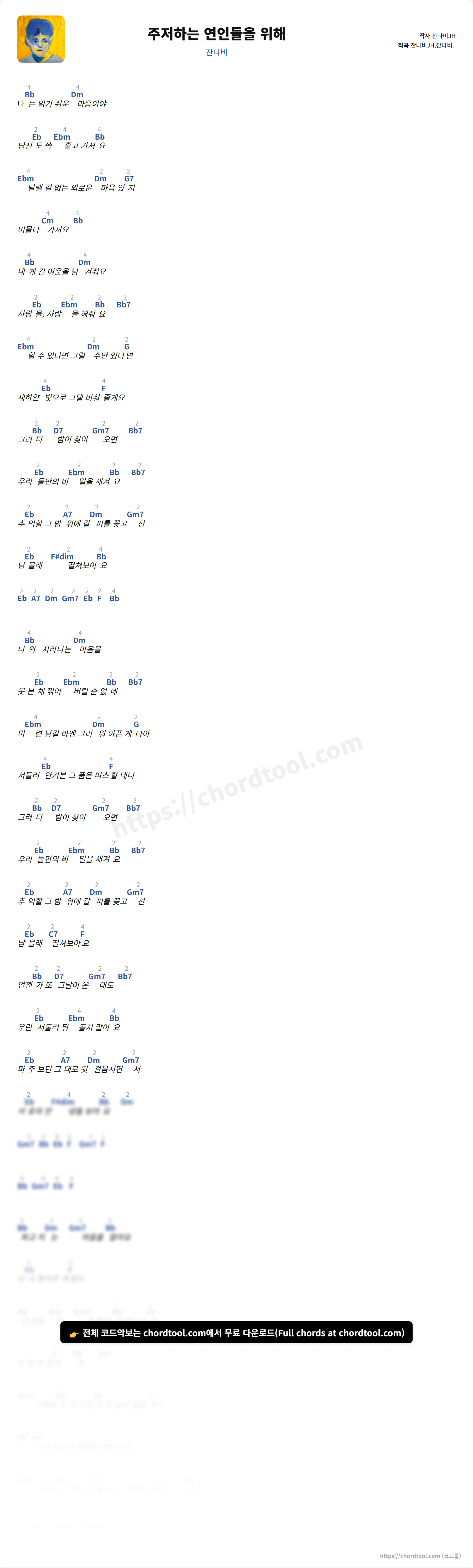 잔나비의 "주저하는 연인들을 위해" 가사 페이지입니다. 곡 정보와 함께 코드 진행, 악보 제공 여부를 한눈에 확인할 수 있도록 구성했습니다. 원키는 Bb입니다. 남자키 G, 여자키 C 정보도 함께 제공합니다. 현재 코드악보가 제공되고 있으며 다양한 악기 코드표도 확인 가능합니다. |
