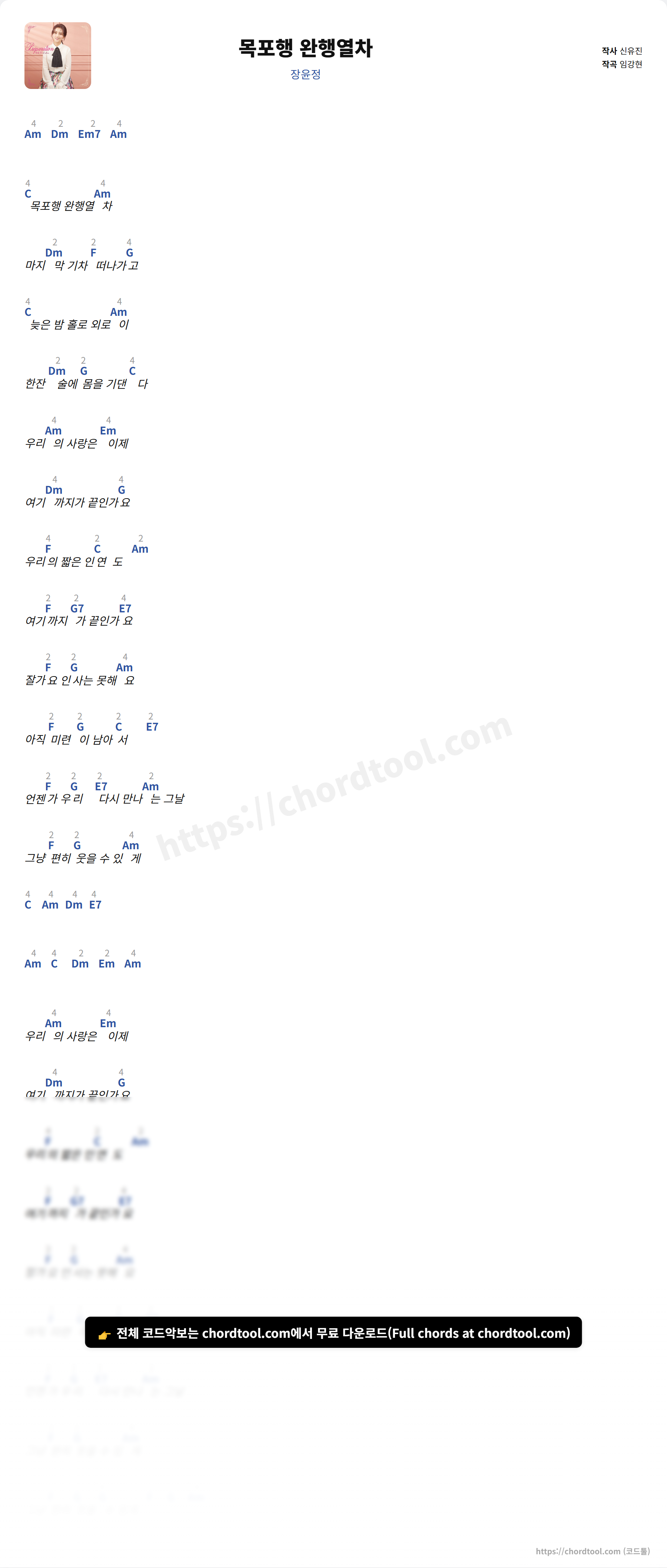 장윤정의 목포행 완행열차 가사를 확인할 수 있습니다. 곡 정보와 함께 연주에 필요한 코드, 악보 제공 여부도 함께 정리했습니다.