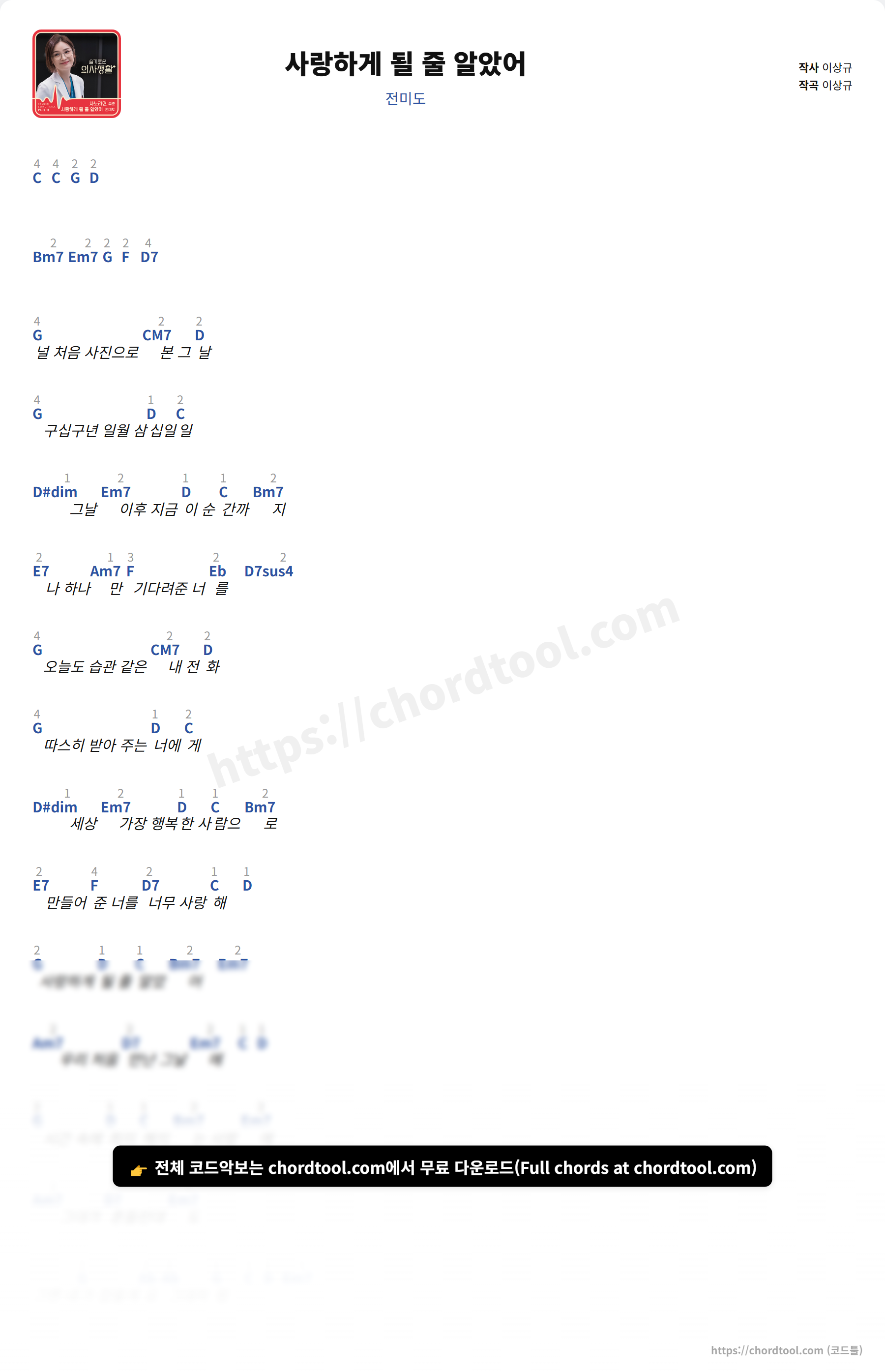 전미도의 "사랑하게 될 줄 알았어" 가사 페이지입니다. 곡 정보와 함께 코드 진행, 악보 제공 여부를 한눈에 확인할 수 있도록 구성했습니다. 현재 코드악보가 제공되고 있으며 다양한 악기 코드표도 확인 가능합니다. |