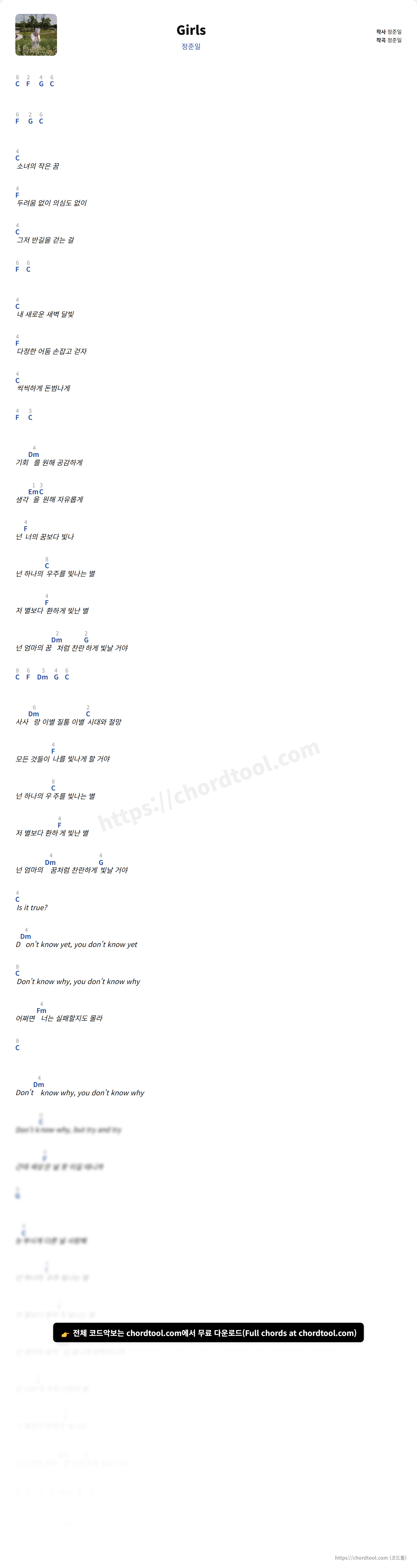Girls는 가사만 찾는 사용자뿐 아니라 기타 코드, 우쿨렐레 코드, 피아노 코드까지 함께 찾는 경우가 많습니다.