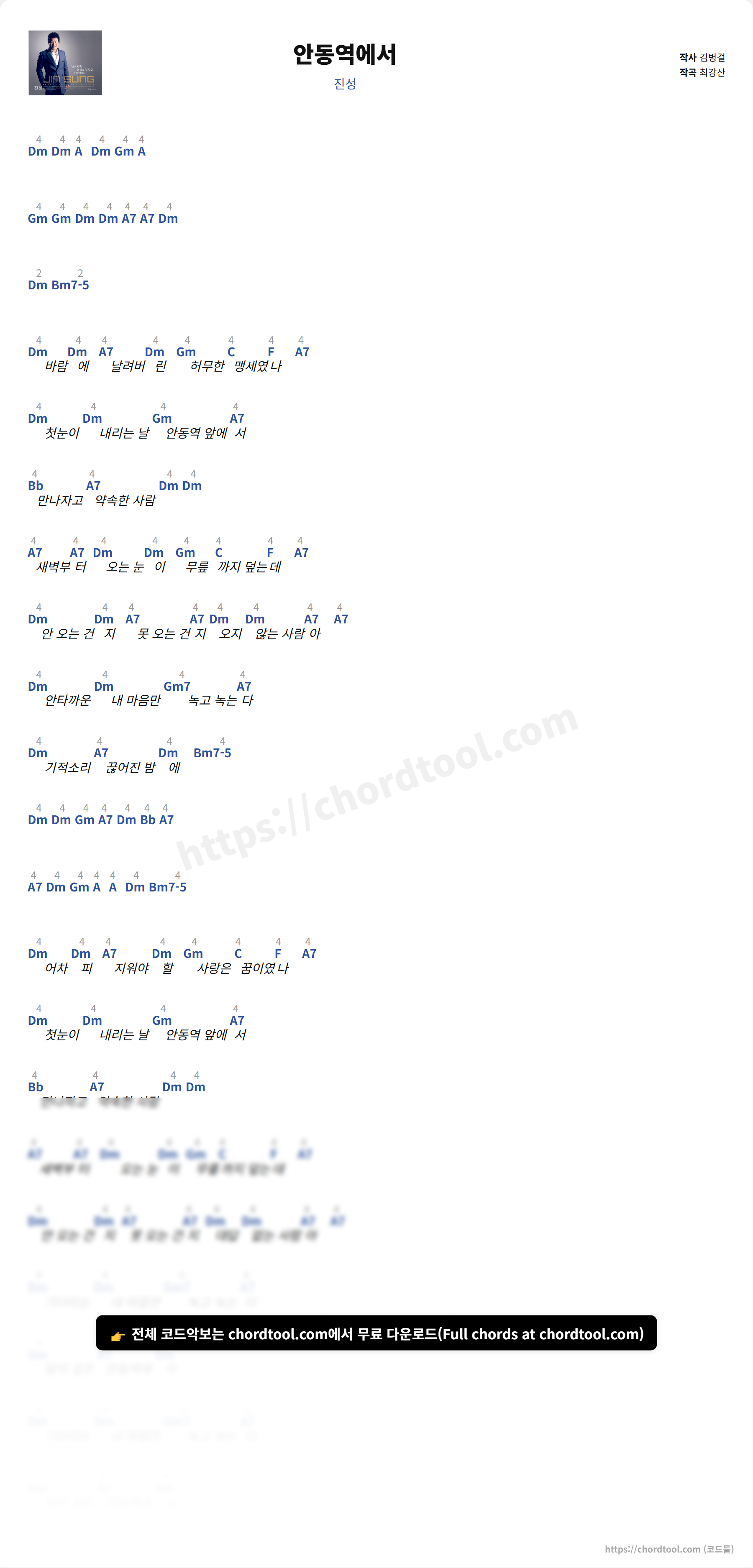 진성의 "안동역에서" 가사 페이지입니다. 곡 정보와 함께 코드 진행, 악보 제공 여부를 한눈에 확인할 수 있도록 구성했습니다. 원키는 C#m입니다. 남자키 Cm, 여자키 Fm 정보도 함께 제공합니다. 현재 코드악보가 제공되고 있으며 다양한 악기 코드표도 확인 가능합니다. |