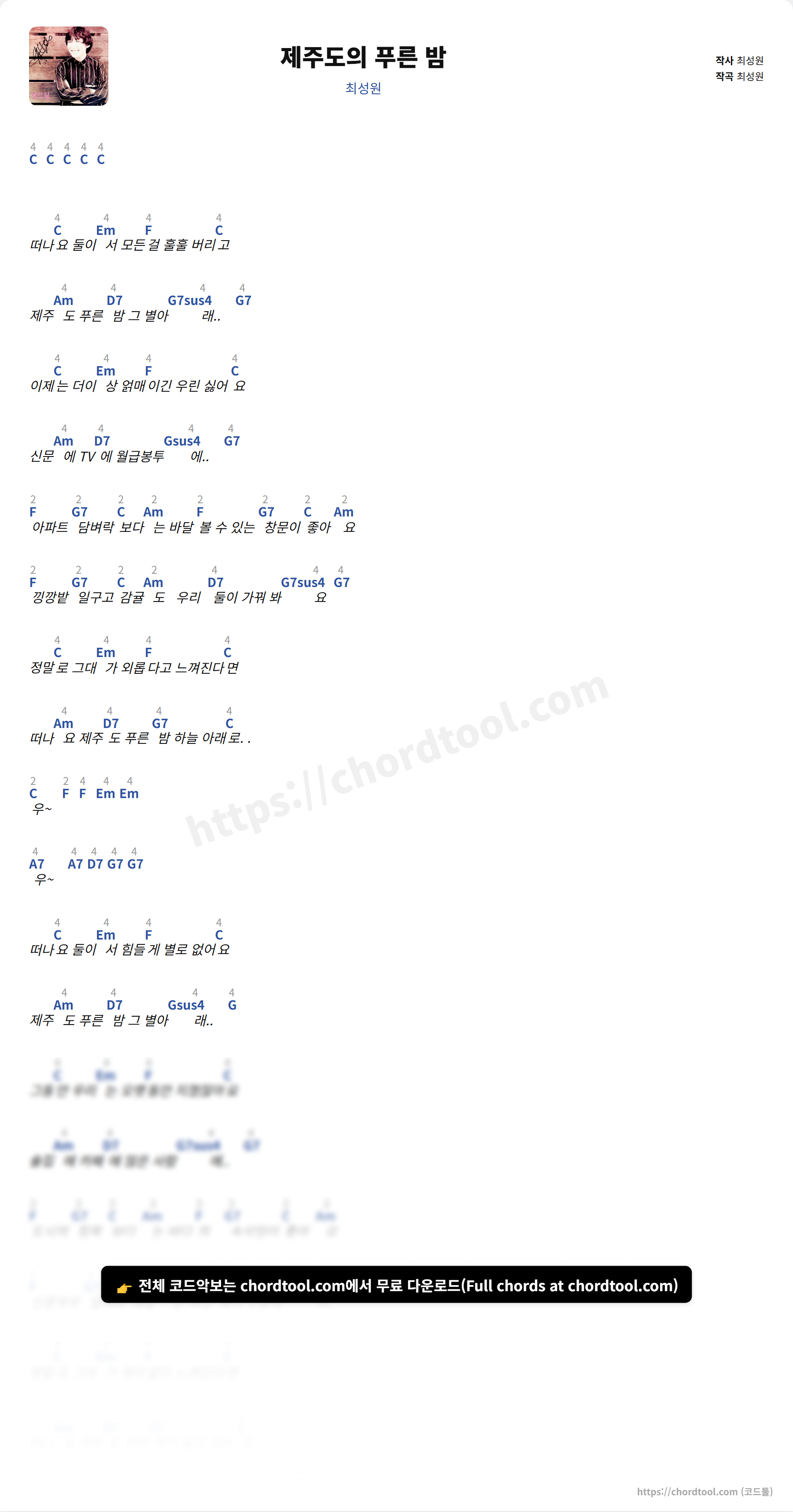 최성원의 제주도의 푸른 밤 가사를 확인할 수 있습니다. 곡 정보와 함께 연주에 필요한 코드, 악보 제공 여부도 함께 정리했습니다.